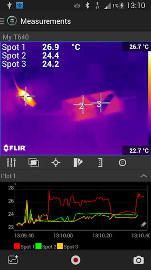 - Create and configure temporal plots based on results of measurement tools on the infrared image.