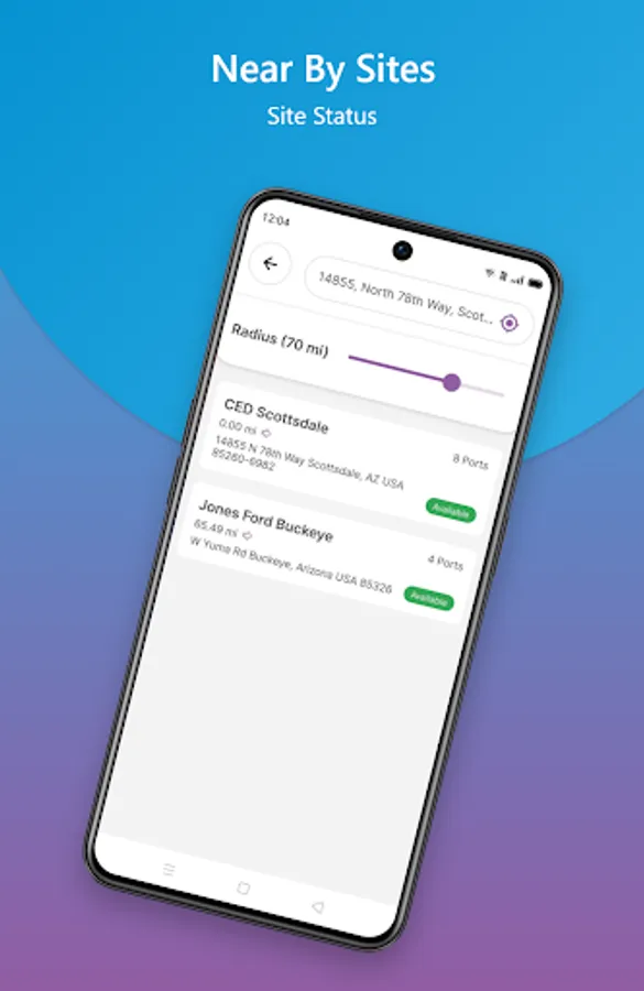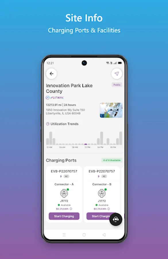 - Details Site Info Screen: You can view detailed information about charging stations, including location, Availability, Amenities, Pricing, Opening times and more.