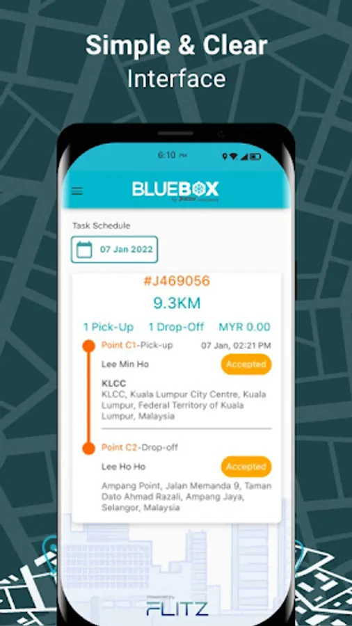Through the Bluebox x Flitz Agent App, agents/drivers/team members will get all the assigned task details by the company instantly and to complete the tasks with simple steps.