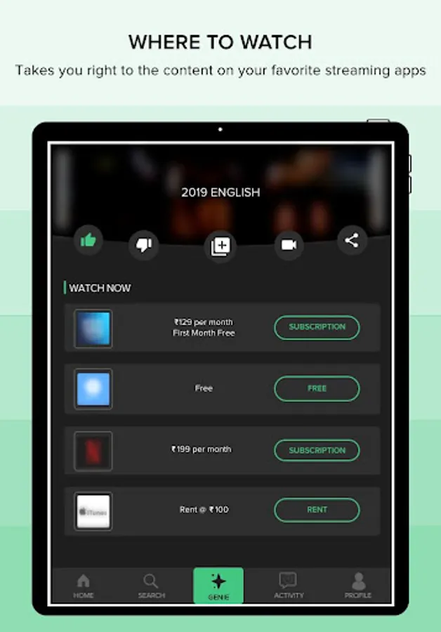 Note: Flixjini does not stream content or charge any fees. It takes you to the right place which streams content which may be free, on subscription, on rental or for purchase.