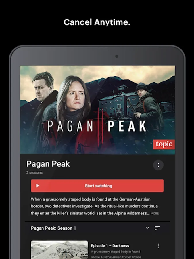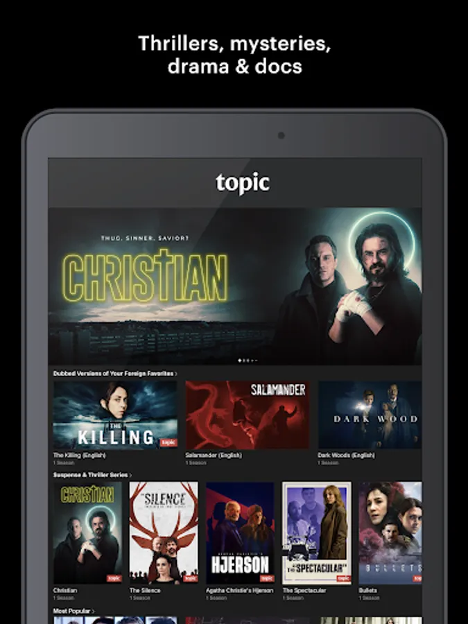 Topic is THE streaming service that introduces groundbreaking crime, thrillers, dramas, and docs from around the world to a North American audience. Taking you to more than 40 countries, our exclusive TV series, award-winning movies, and critically acclaimed documentaries offer a unique window into the unseen.