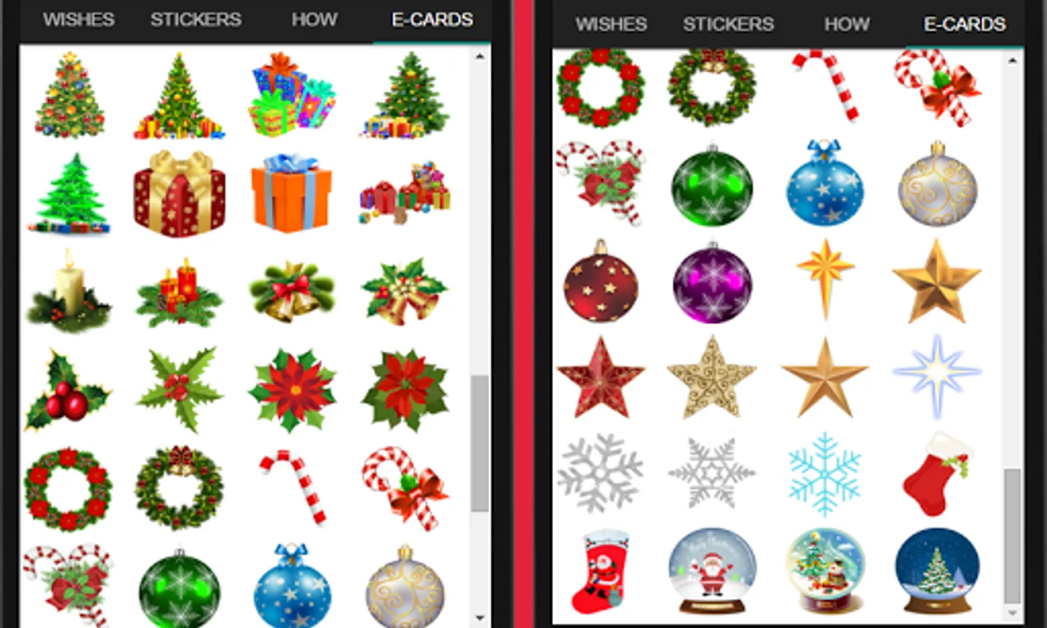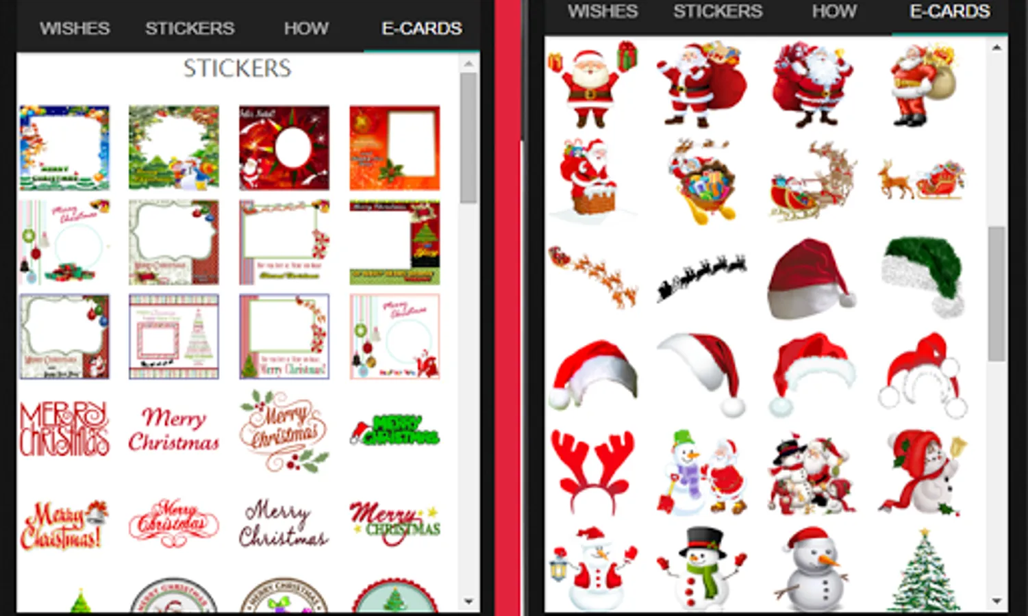 Christmas: Cards & Stickers allow you to choose from many cards which you can type your messages, or just send the readily e-cards. Or you can also select and use the Christmas frames application to capture your selfie, wefie or any photo and send them as your greetings. You can also use the photo editors to frame or edit and design / decorate your existing photos.