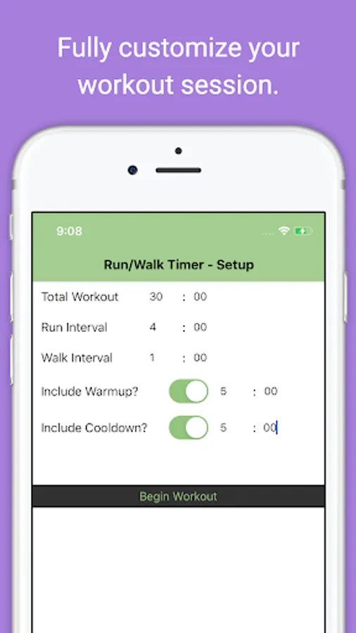 Run Walk Timer allows you to fully customize all of your run walk intervals with ease. Choose your total time, run and walk segments, and whether or not you'd like to warmup or cooldown. Can be used with any training plan, you choose the times and hit the road toward your next goal.