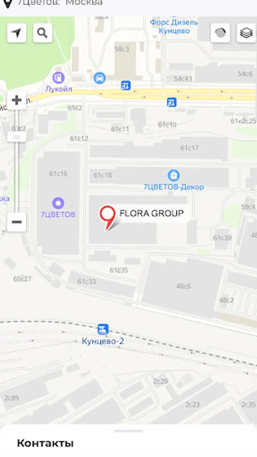 The "Contacts" section contains a map with a dot, the full address of the company, phone numbers, as well as contacts of the attached manager (when authorizing) and links to social networks.