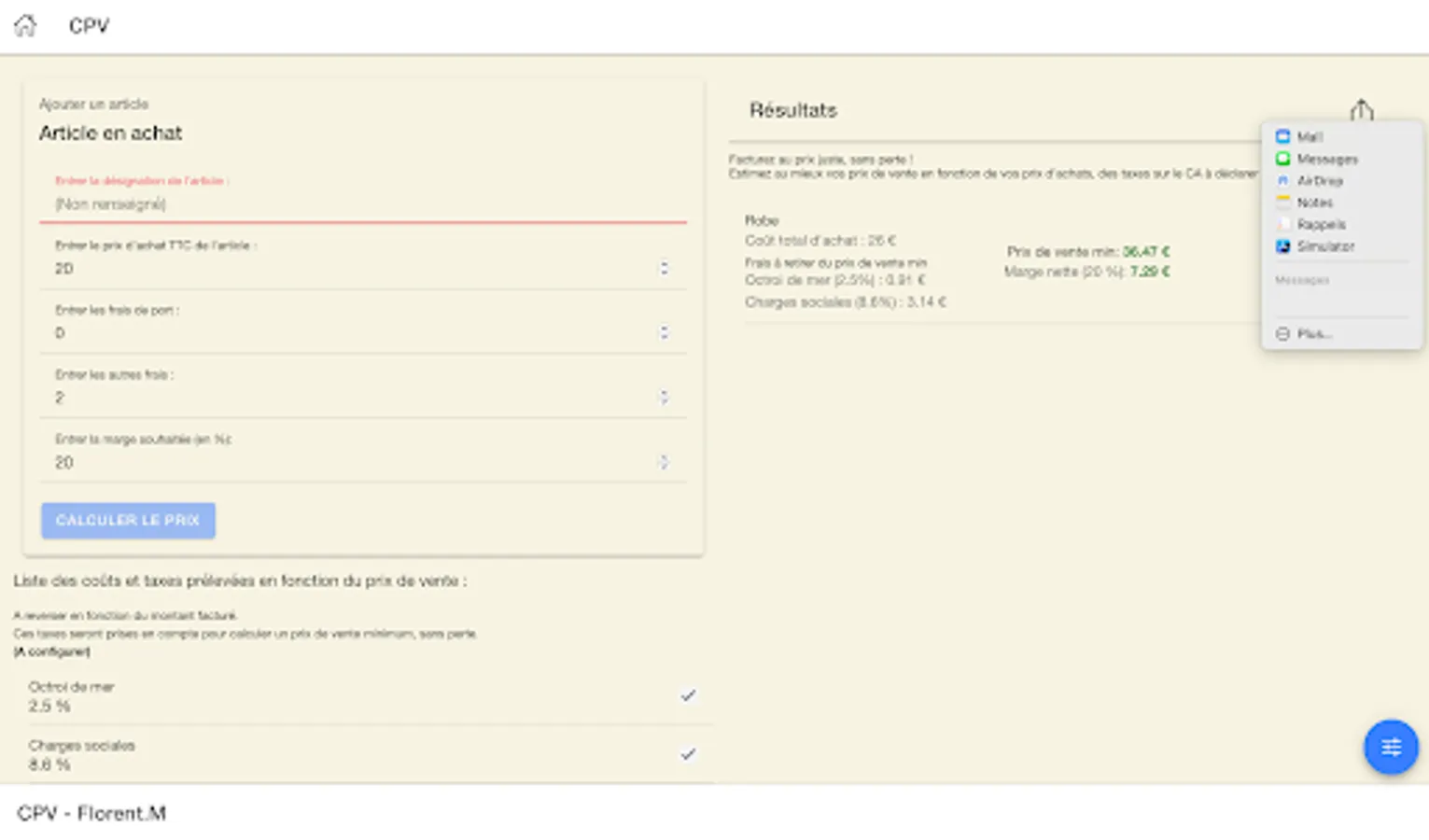 The application gives you the minimum sale price so as not to lose money after taxation, but also the sale price with the desired margin.