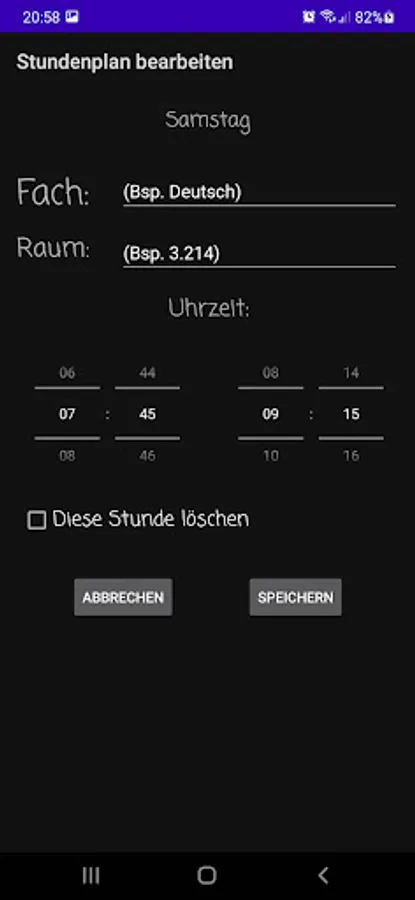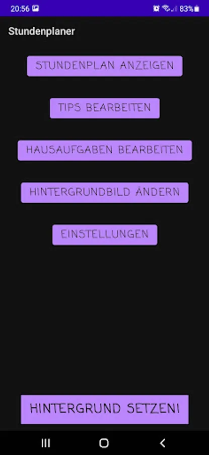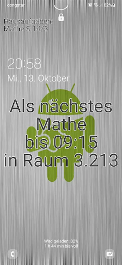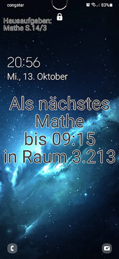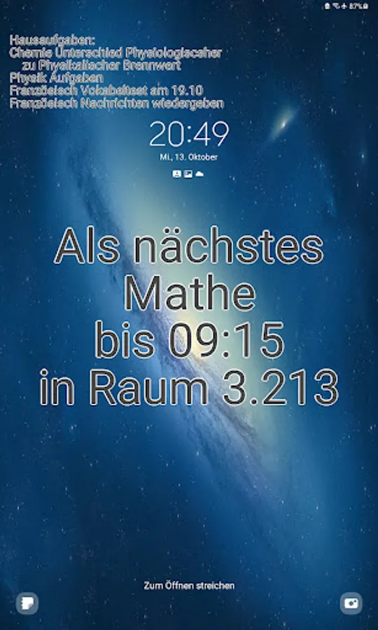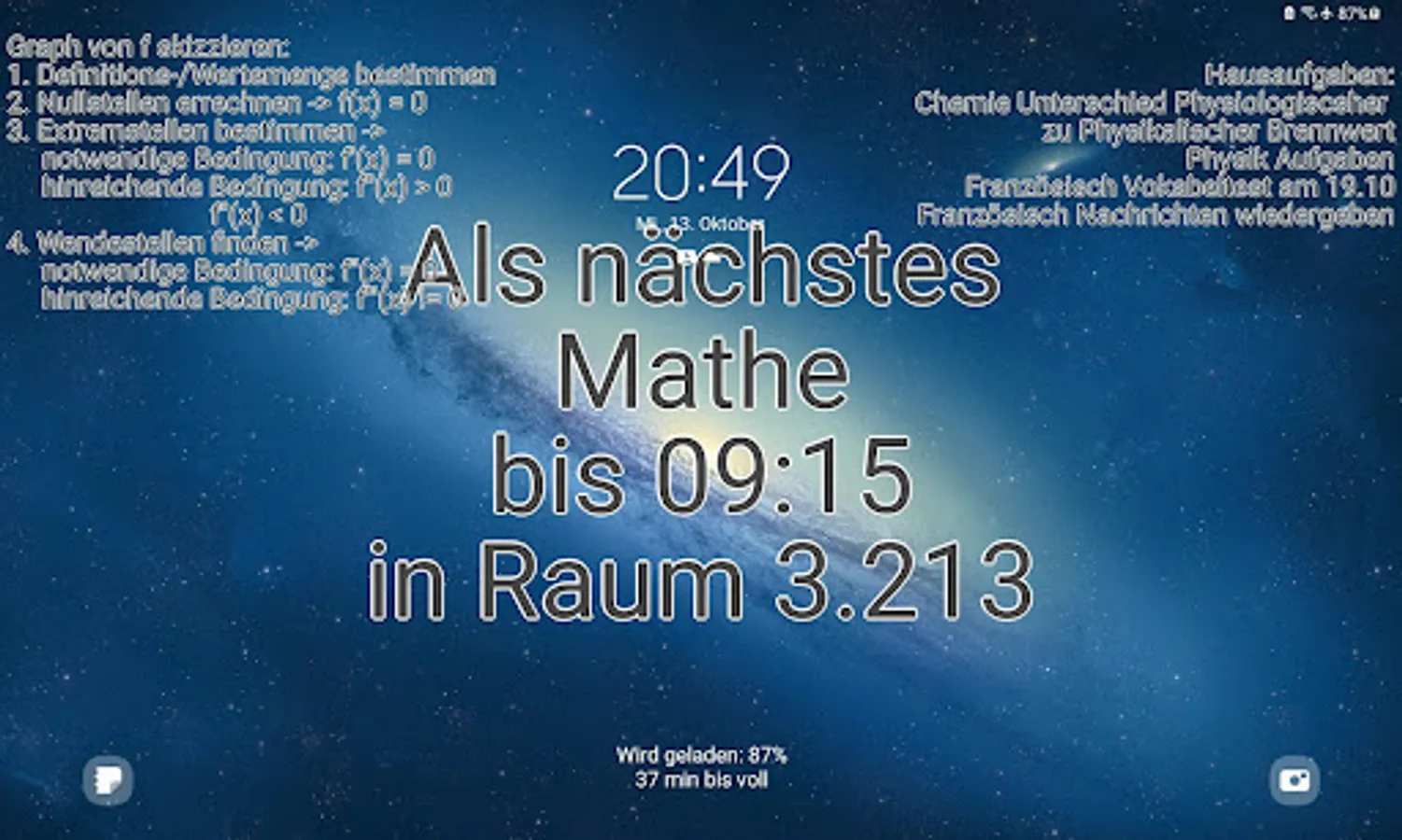 With this app you can set your background image in such a way that it shows you which of your subjects will take place next in which room. You can also design the free space so that memory aids and your homework are displayed.