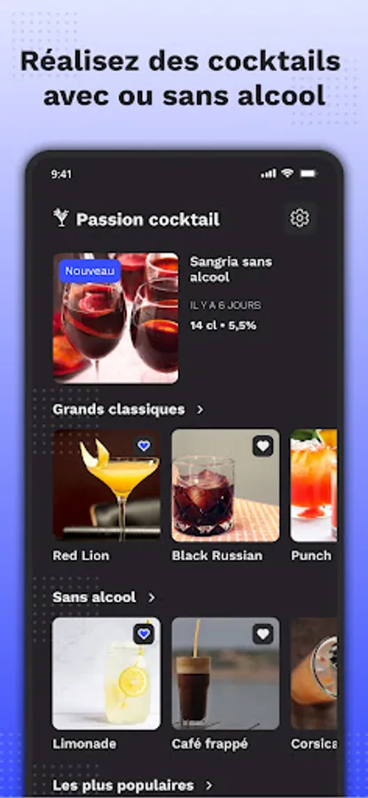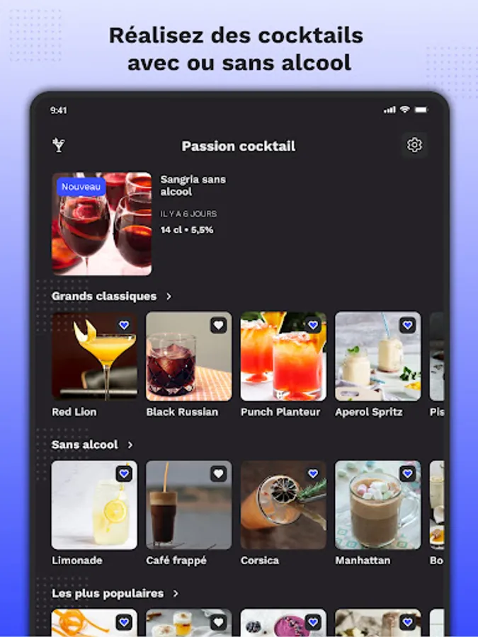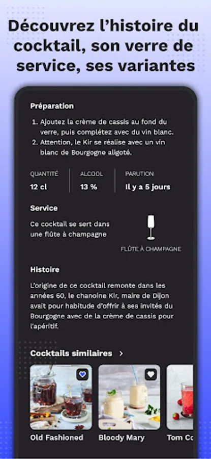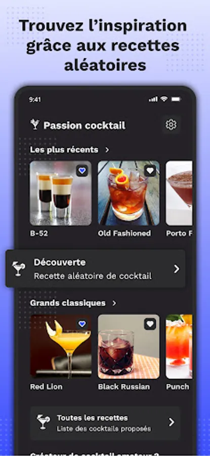Thanks to the categorized recipes, choose the perfect cocktail for every occasion: summer cocktails, festive cocktails, great classics, alcohol-free, shooters, popular cocktails, etc...