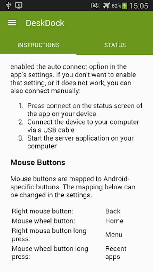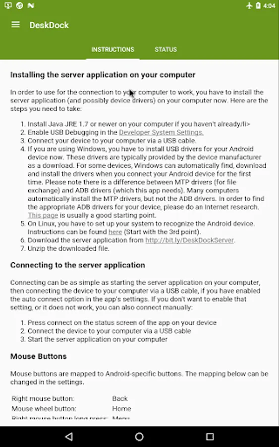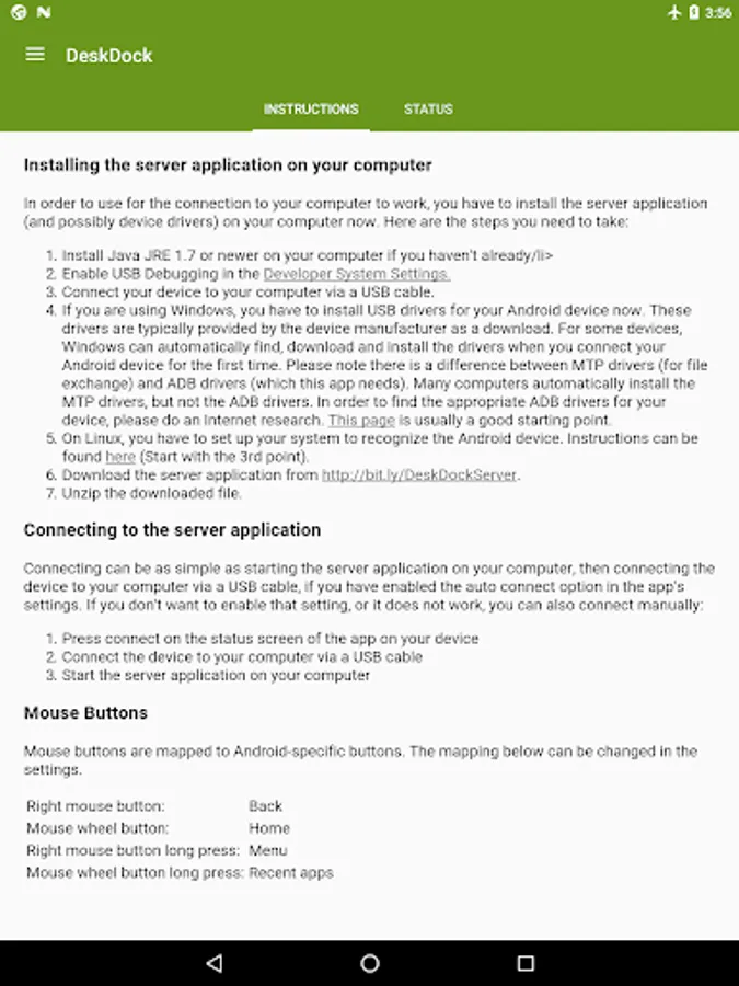 This app requires a free server application to run on your computer that can be downloaded here: http://bit.ly/DeskDockServerW. The Java Runtime version 1.7 or later is needed on the computer. Depending on your system, device drivers may have to be installed.
