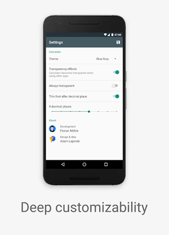 Opening the Settings gives you the option to choose between one of four themes, option for transparency effects as well as other various settings. You also have an button to launch your device's built in calculator if you need to solve more advanced calculations.