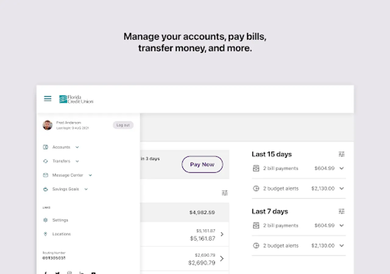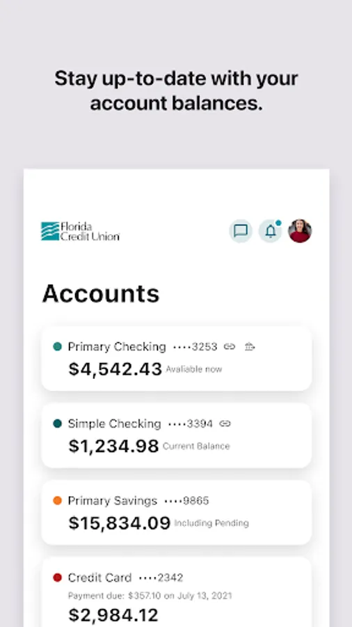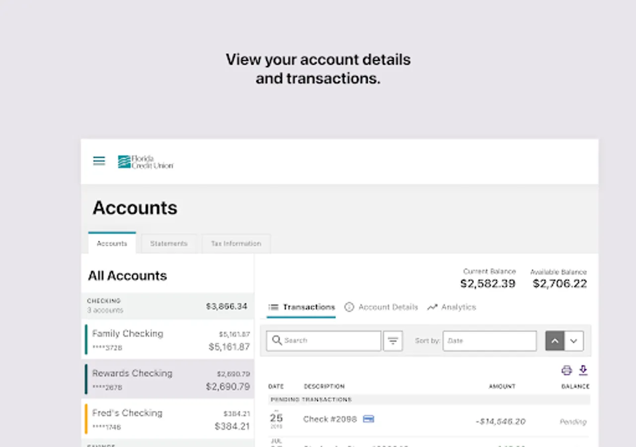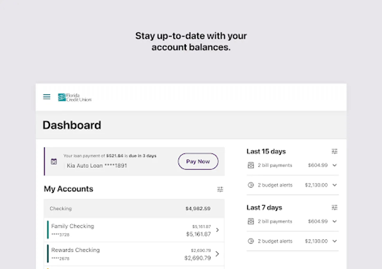 Florida Credit Union Mobile Banking allows you to check balances, view transaction history, transfer funds, and pay loans on the go!