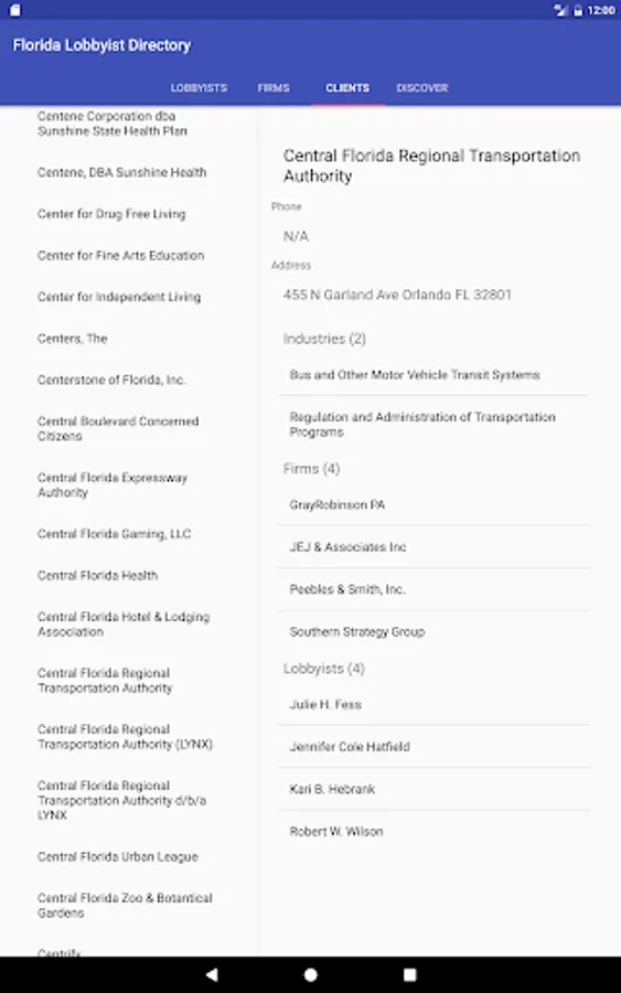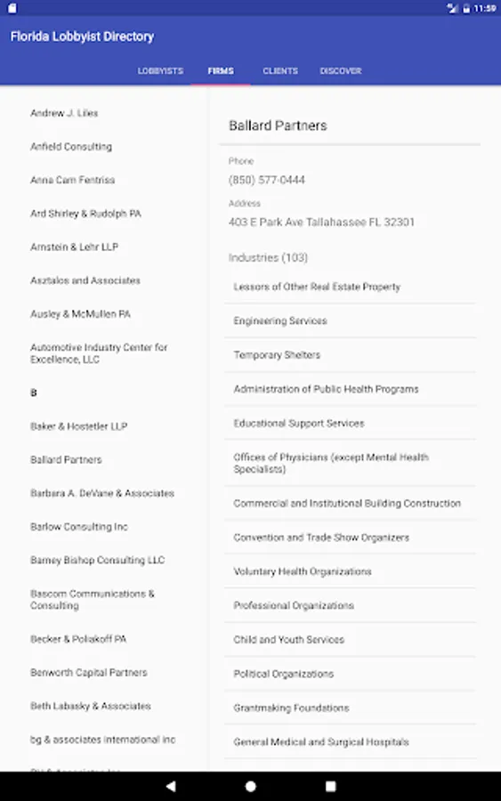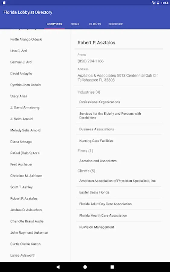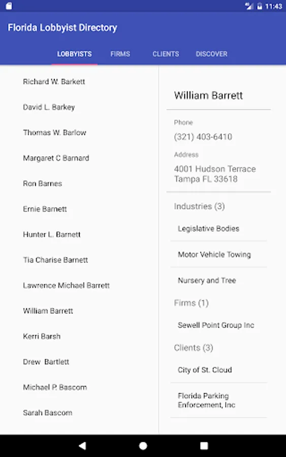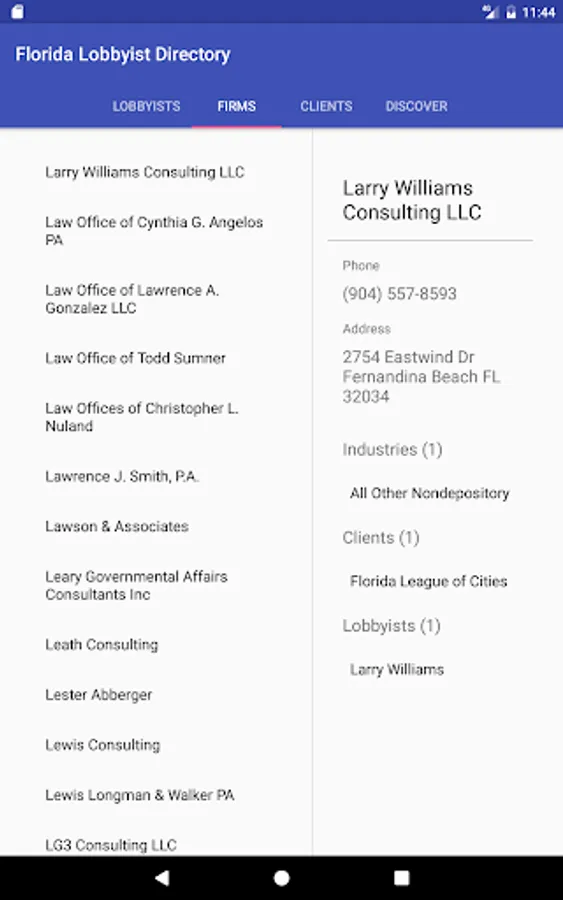 LOBBYISTS: Browse alphabetically or search through a list of Florida's registered lobbyists. Easily identify how many clients and firms they're connected to, and learn of their registered address and phone number!