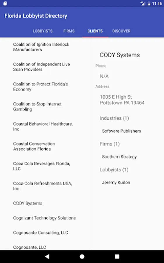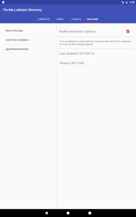 Quickly browse or search through registered lobbyists, their clients, and the firms who represent them. This app implements all-new data for 2017, with built-in automatic updates.