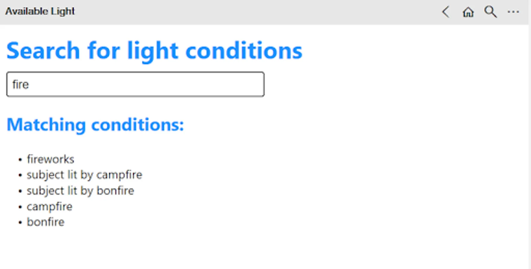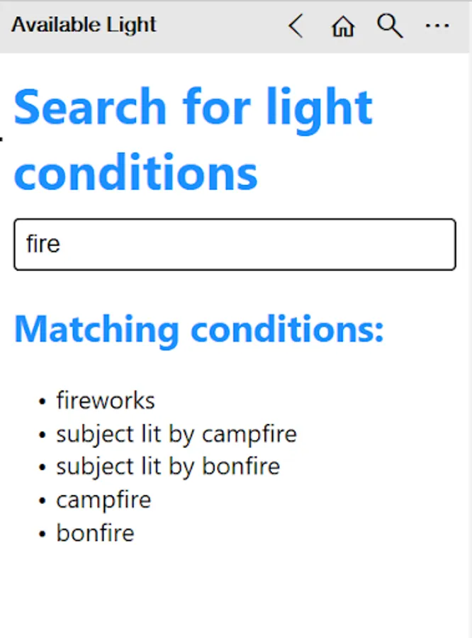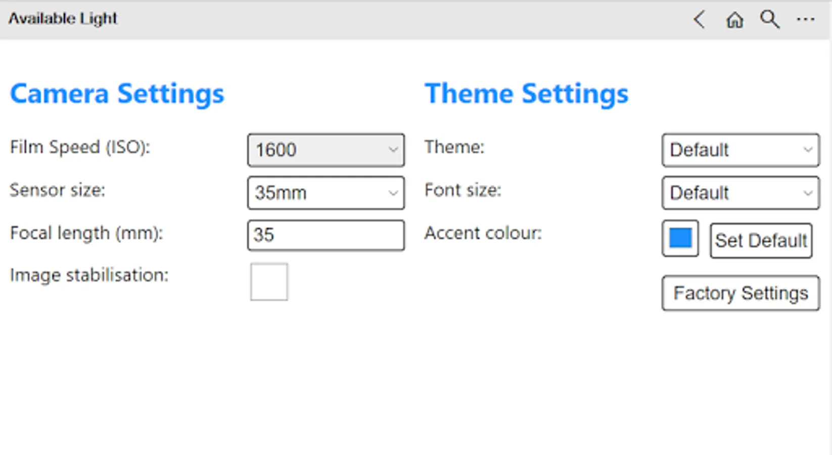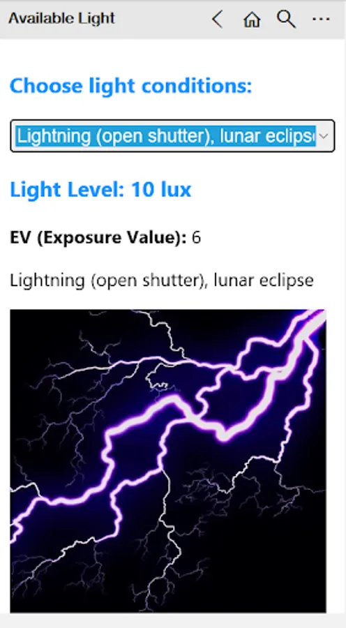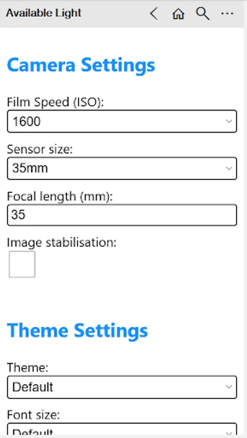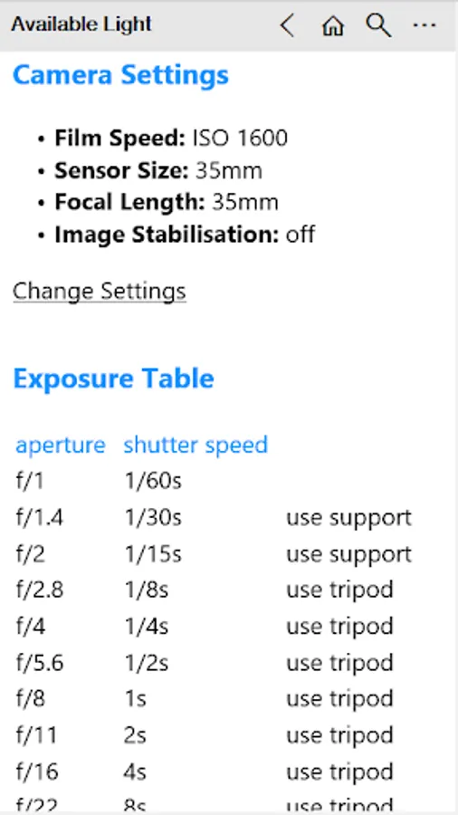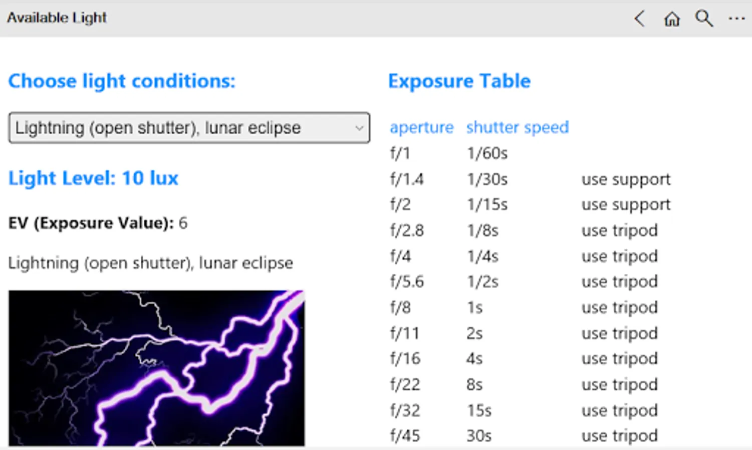 Modern cameras have great built-in light meters, but sometimes taking photographs using available light (i.e. without flash or other photographic lighting) can be a challenge, especially with long exposures in low light levels or very high intensity lighting. Fortunately in extreme conditions you can usually use an exposure guide like this one. Simply enter your film speed setting, choose the lighting conditions from the list and then see a table of shutter speed and aperture combinations. This table allows you to use a camera with manual control in conditions outside the range of the built-in light meter. The app will also compute the Exposure Value and light level in lux. It's a simple tool to help you take good photographs in difficult conditions.