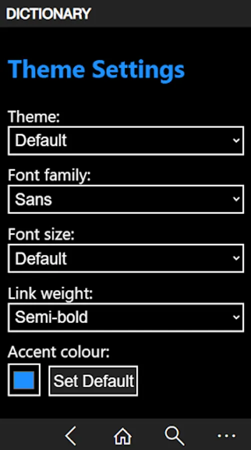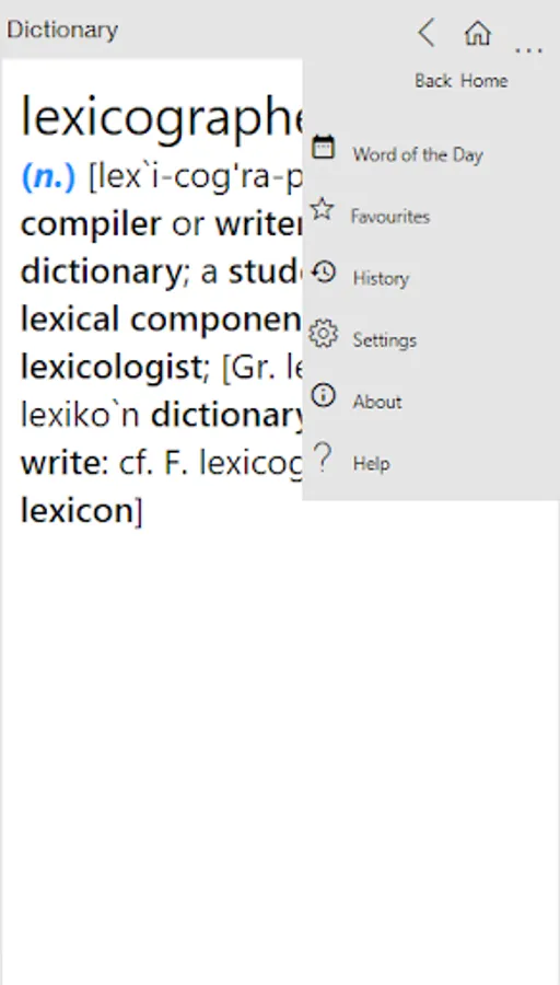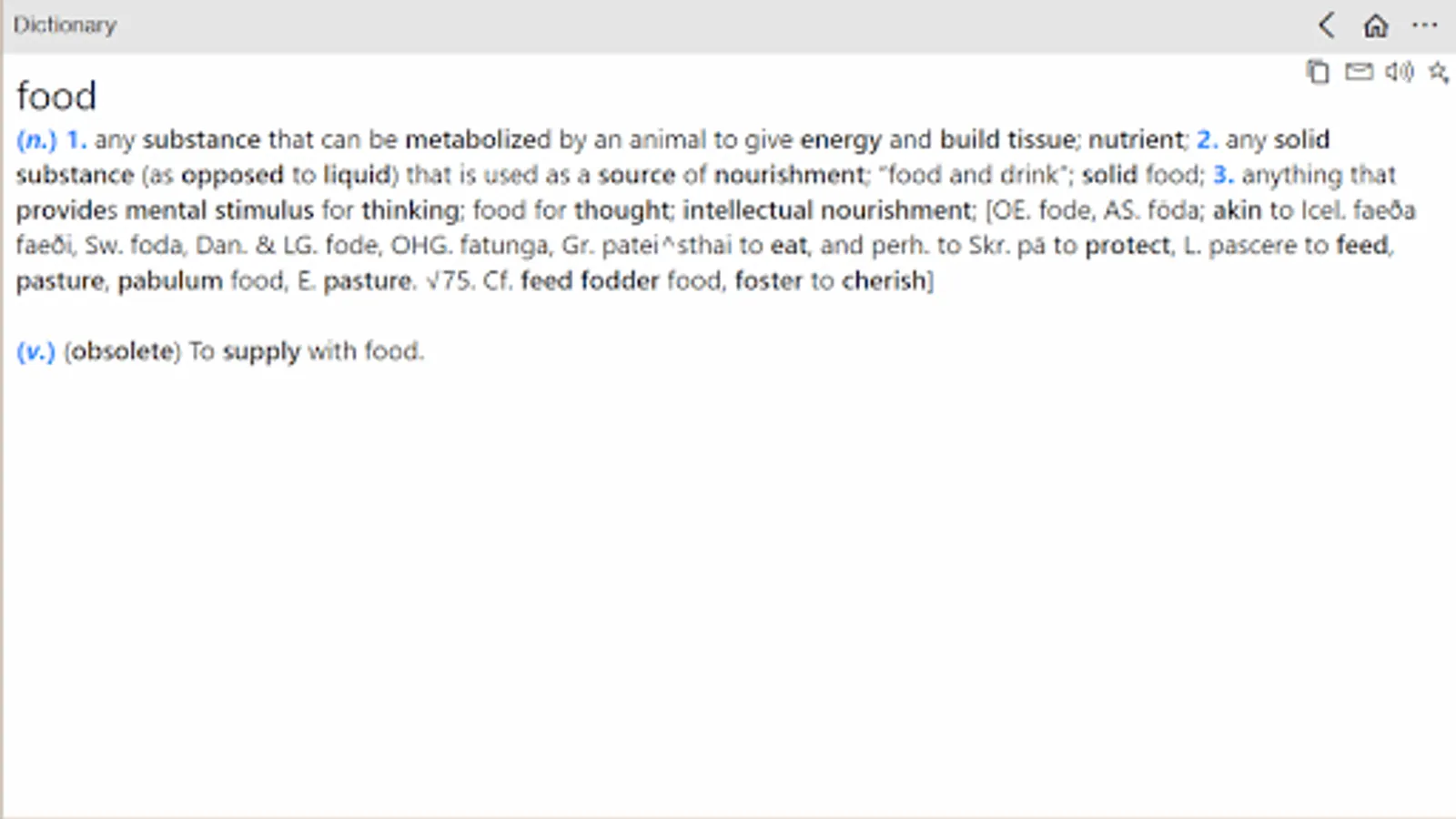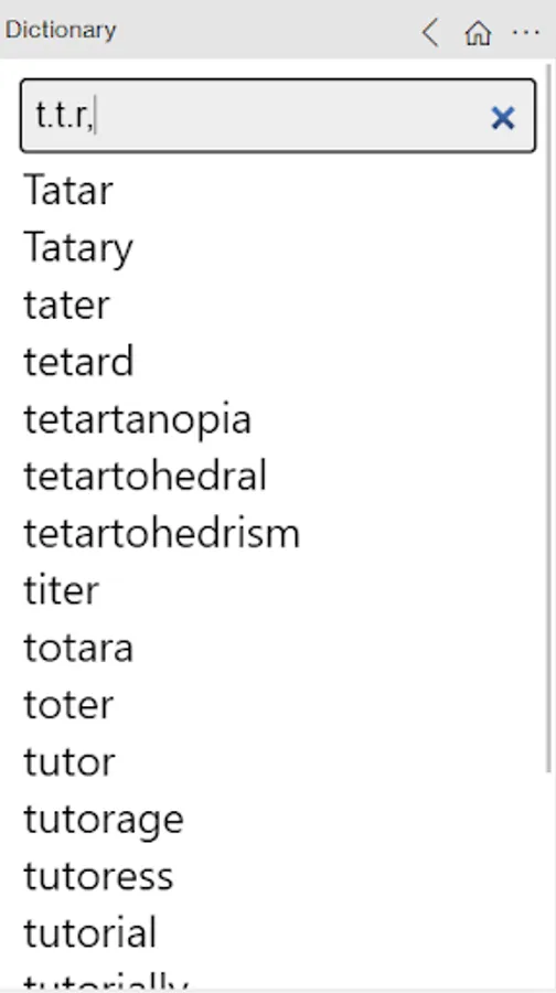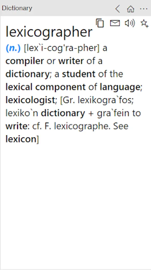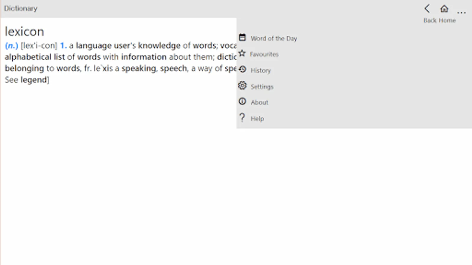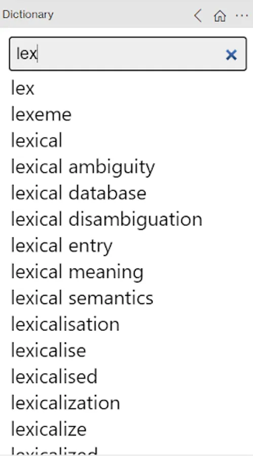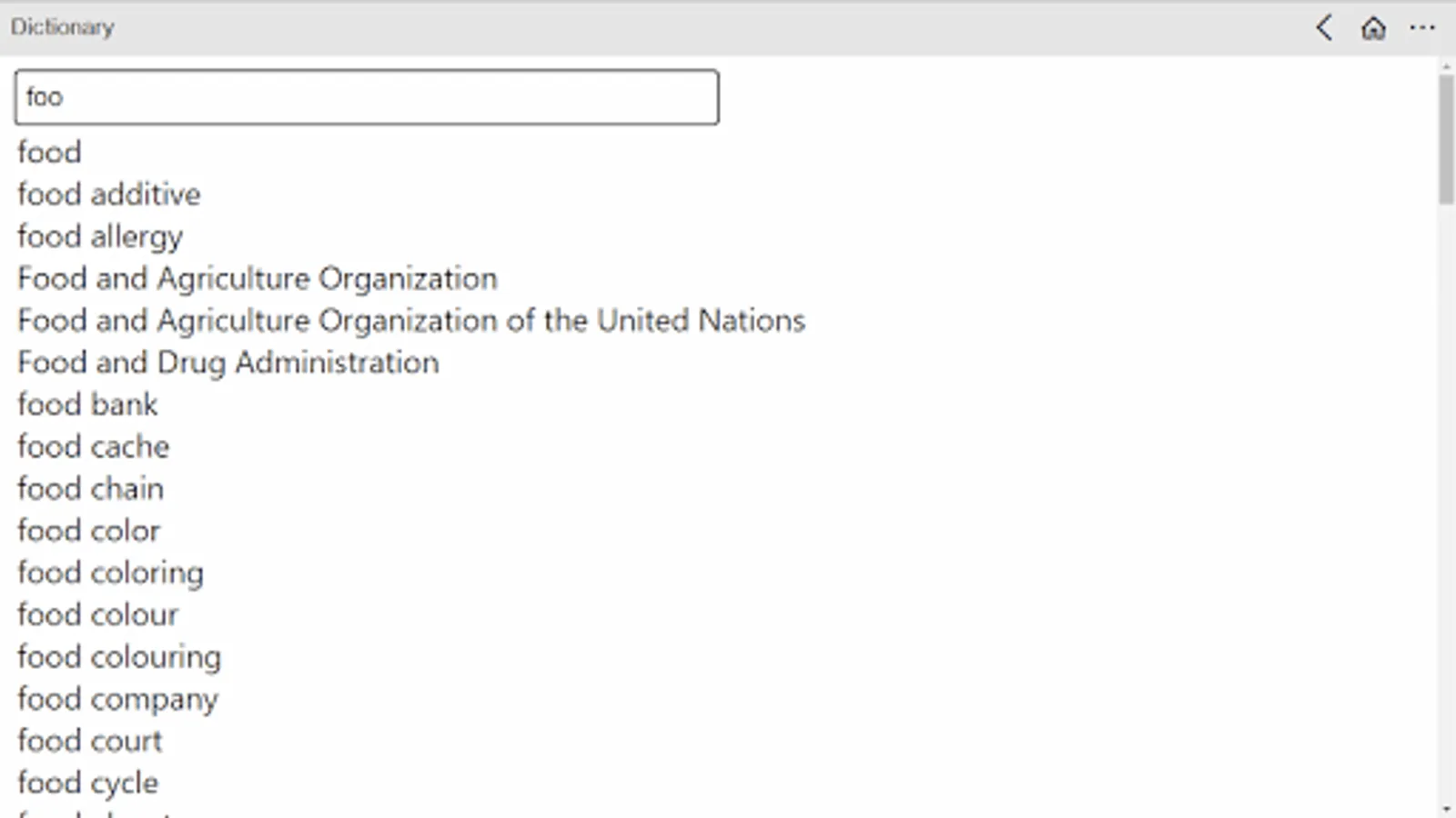 As you type, Dictionary homes in on the word you are looking for. Then you can follow the links in the definition page to get more word definitions. Wildcard characters can be used to help with word games like crosswords and scrabble where only some of the letters are known, or you have to find an anagram, or with spelling. Definitions include synonyms and antonyms which allows the dictionary to also serve as a thesaurus. The speech function helps provide the correct pronunciation.
