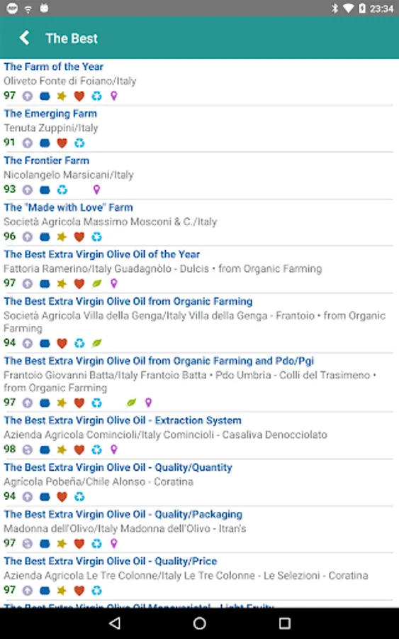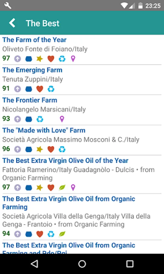• Look for one of the extra virgin olive oils included in the book according to farm name, geographical area, ranking, price range, intensity of fruitiness, denomination of origin, from Organic Farming, value for money.