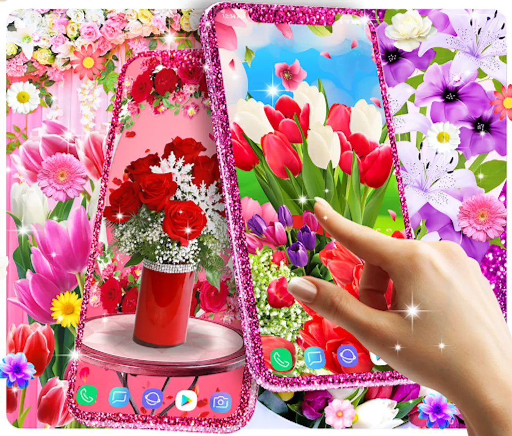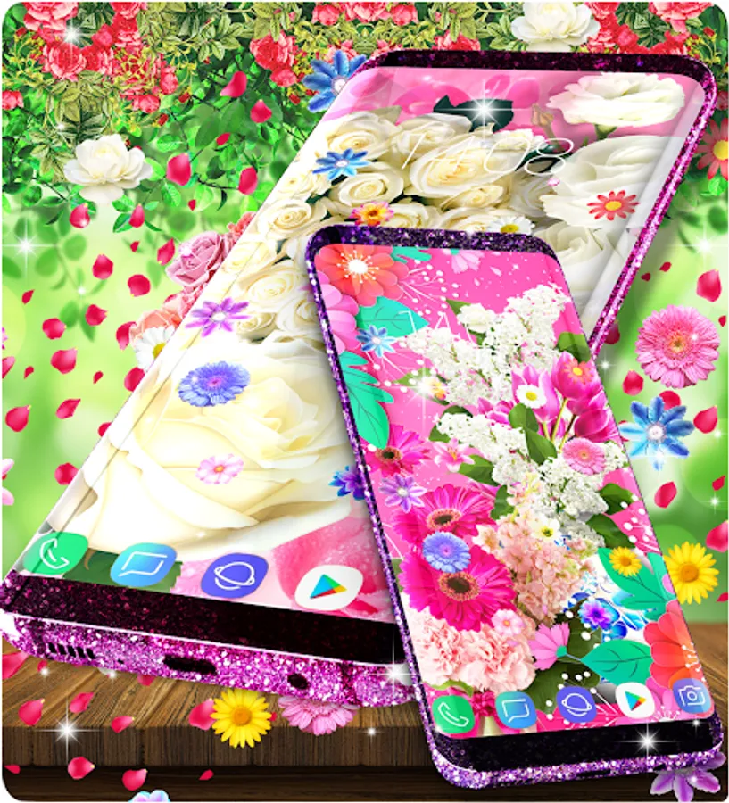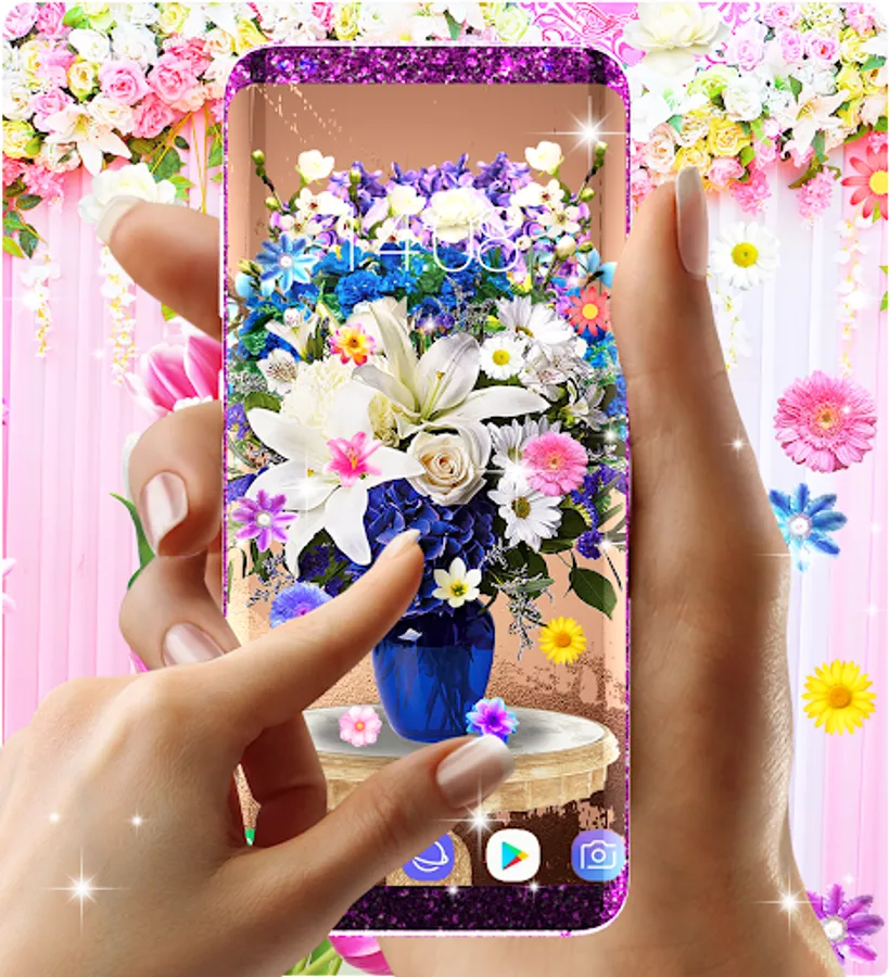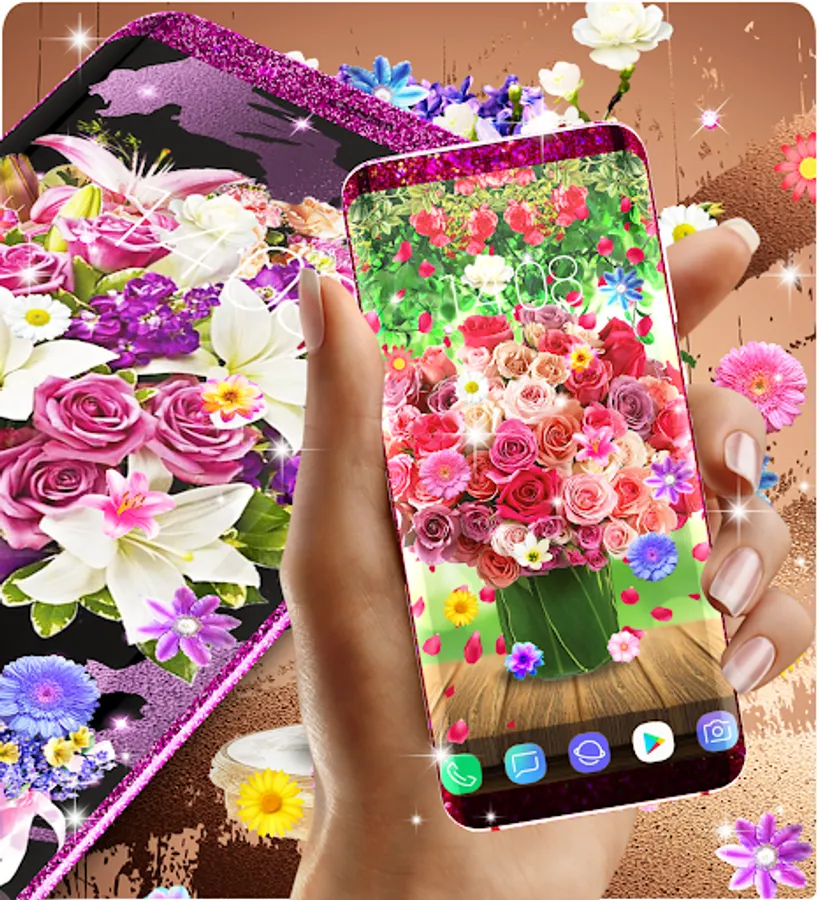 Flowers bouquet live wallpaper is a new beautiful app with various flowers images and live animations. You will find hd images with flowers elements and pink, purple or blue colors. Elements will fall over the screen. Create your own live wallpaper, choose your image and elements and personalize it as you wish, you can choose from those elements: diamonds, white and pink roses, sunflowers, pink lily, margaret, passiflora, summer or spring flowers.