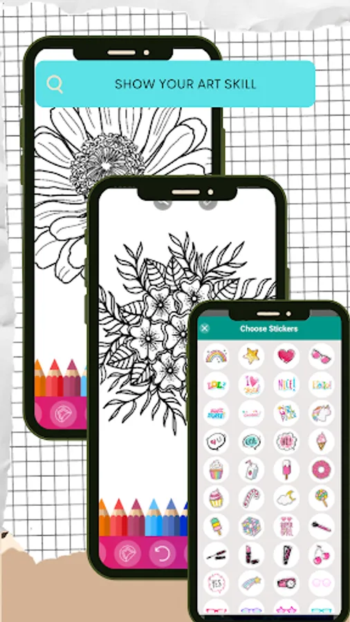 Both simple and complex flower mandala designs for everyone to enjoy and relax with. Tap with your finger on a square to color it in. In addition you can draw lines, insert icons and add texts.