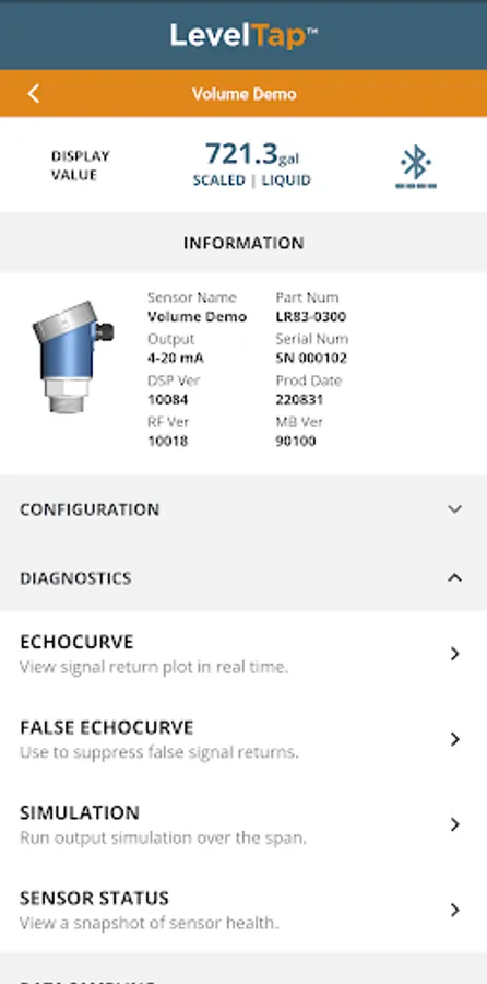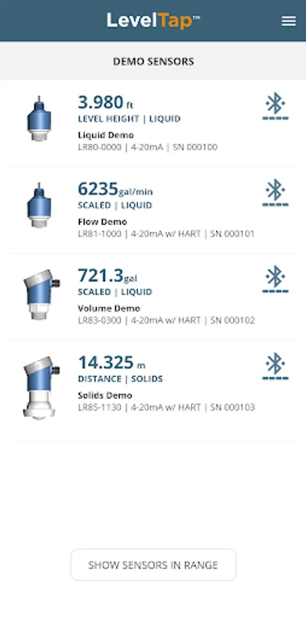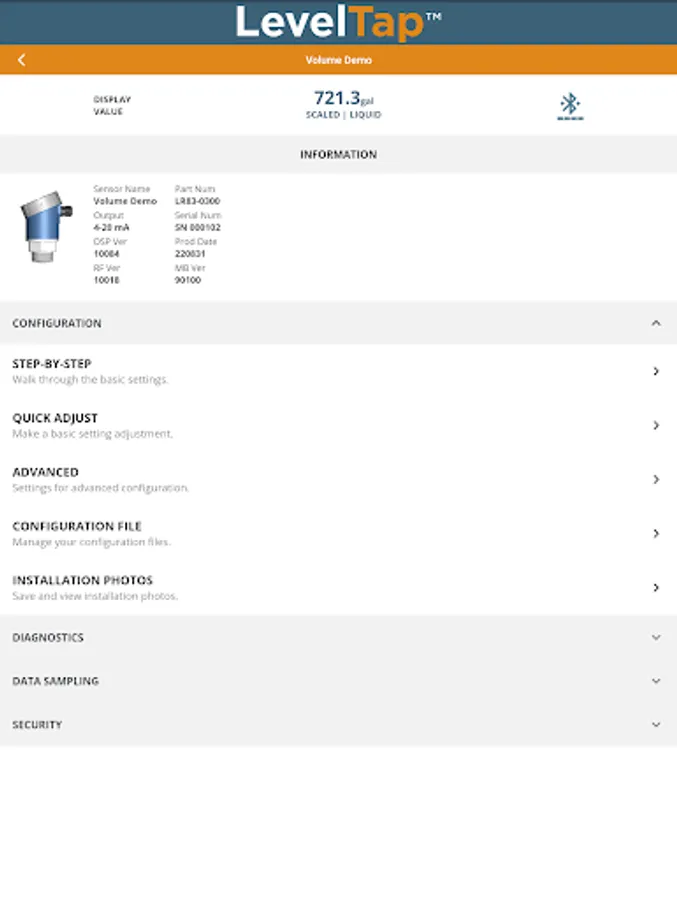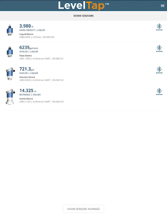 LevelTap enables mobile smart phone or tablet users to wirelessly configure, view level or flow process information and access diagnostic tools for compatible Flowline sensors via a secure Bluetooth connection, all from the safety of the ground or nearby location. Download the free app, register and go to Demo Sensors. There you can view process information and step-by-step or advanced configuration examples prior to sensor purchase.