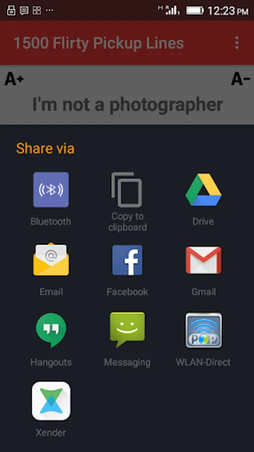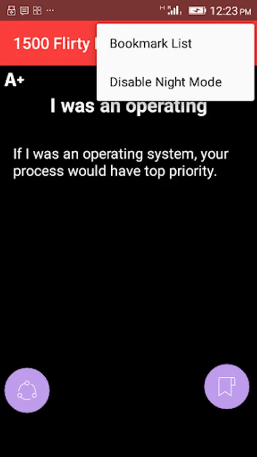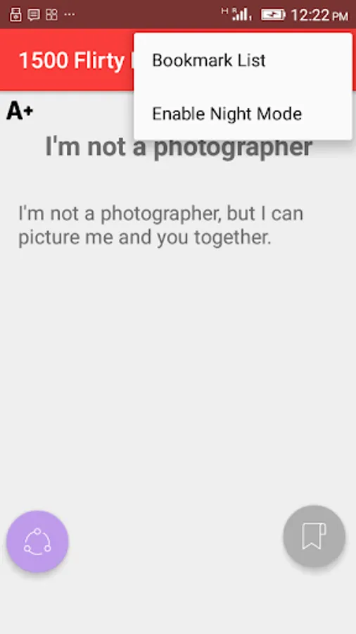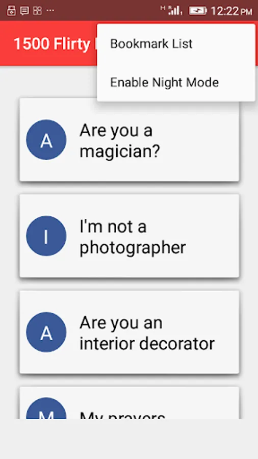 This application lets you browse pick up/chat up lines, and mark them as favorite. Send them through SMS, Email, Messenger etc.