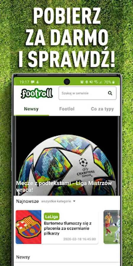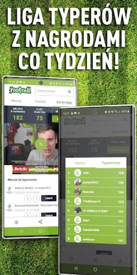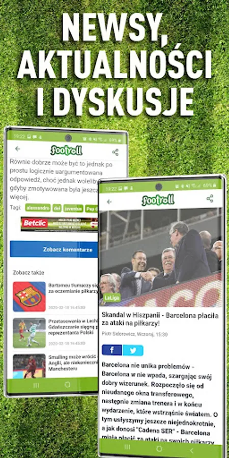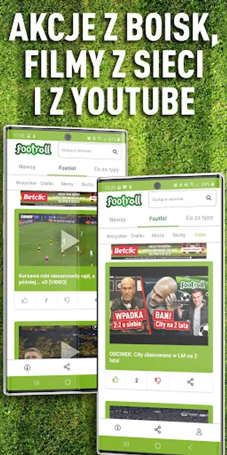Stay up to date thanks to current football news and multimedia. Every day, we post fresh news and comments written by our editorial team of football enthusiasts. In addition, we publish the most interesting statistics and interesting facts from the world of football, as well as won memes for improving humor. There are also video materials from the fields and more! You will never have to complain again that the movie notification from the Footroll channel (the largest subscription channel dedicated to football events in Poland) did not come to you because we have our own push notification system. If you are of legal age, you can also take part in our weekly tipping league "What types" and win prizes equivalent to PLN 1,500.