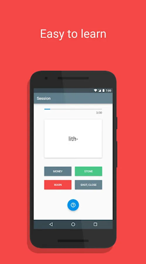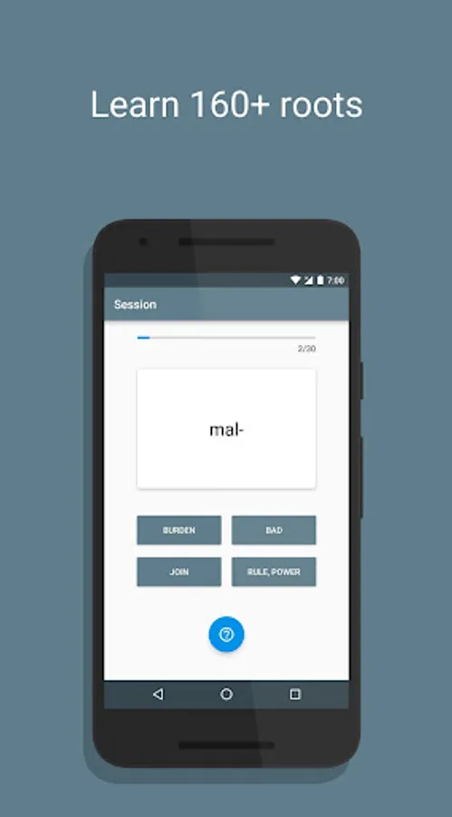 An app that helps the user learn common roots through multiple choice quizzes and thus prepares the user for tests with tough vocabulary words.