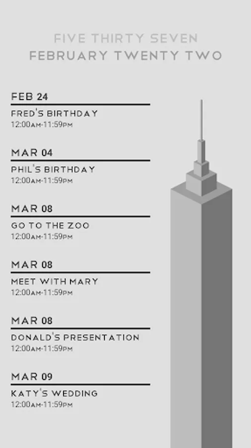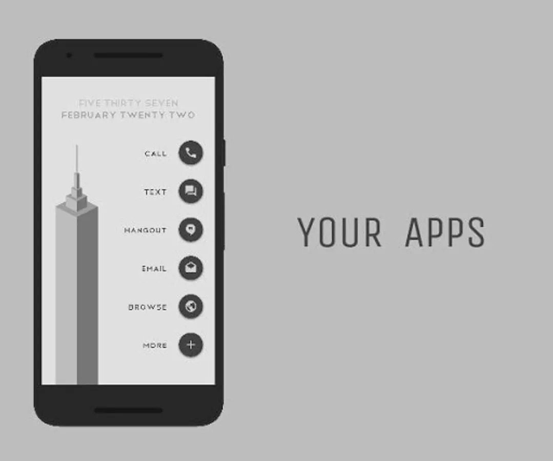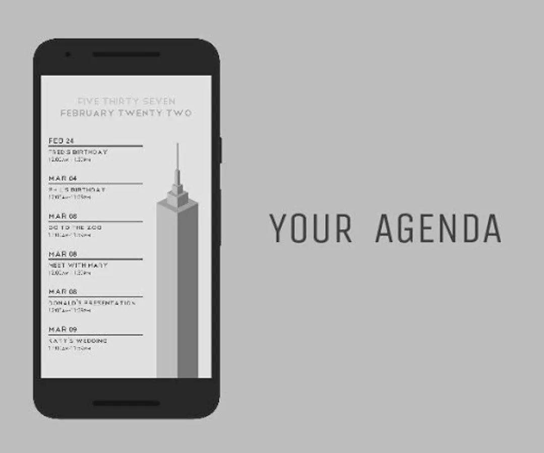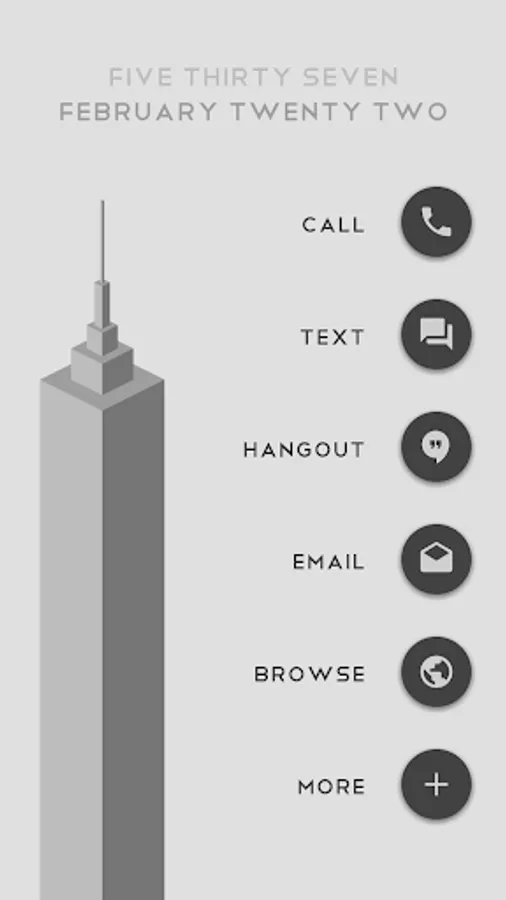 A swipe towards the right will shift the tower to the right, revealing your agenda on the left. A swipe towards the left will shift the tower to the left, revealing your frequent apps/shortcuts on the right. As you swipe, the wallpaper will change from a darker to lighter tone and visa versa.
