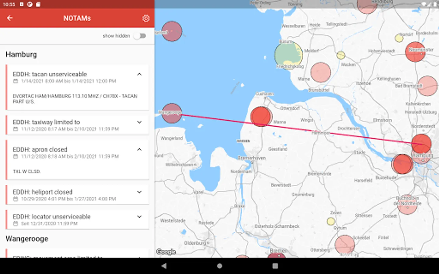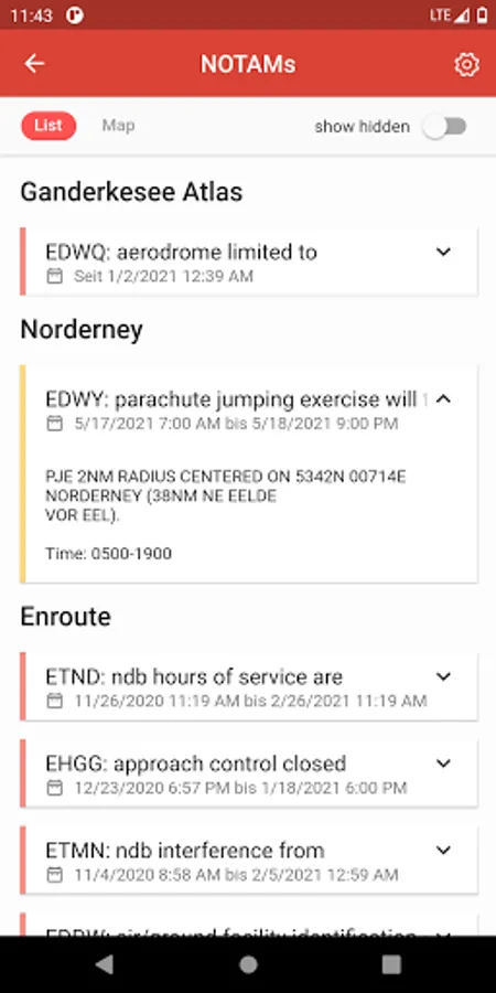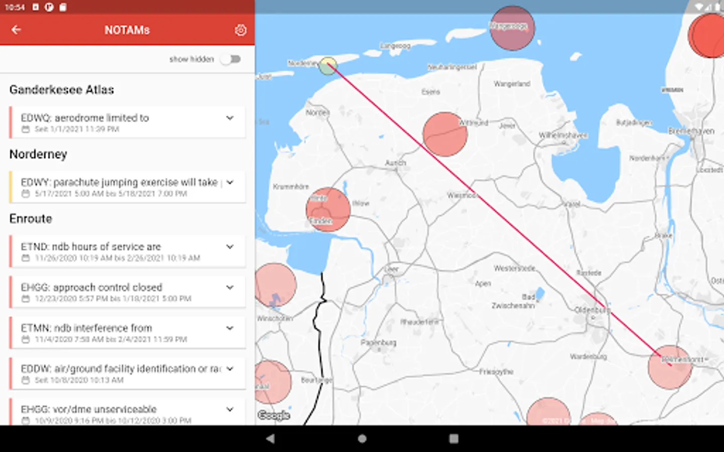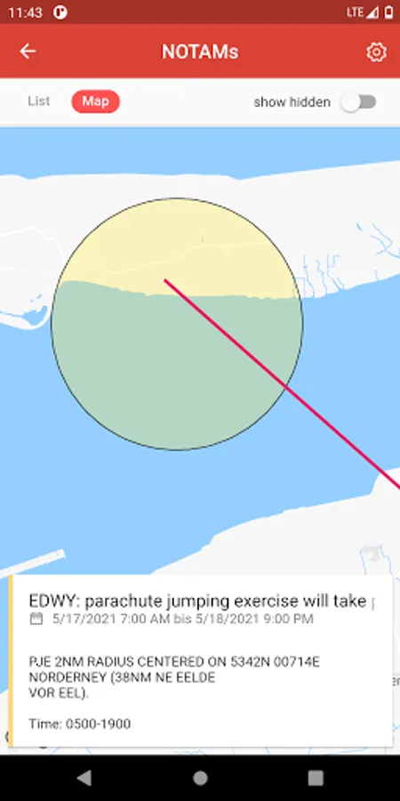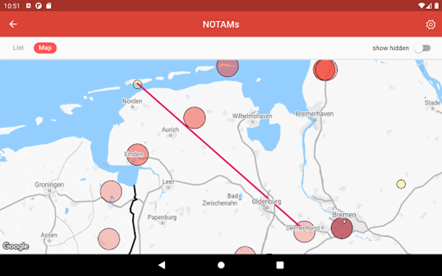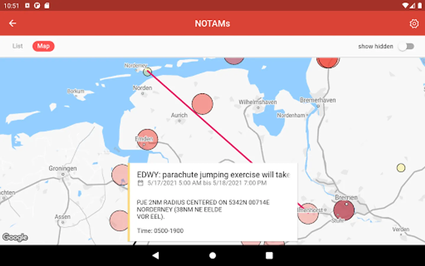 After entering the route, the relevant NOTAMs (notice to airmen) are displayed both as a list and on the map.
