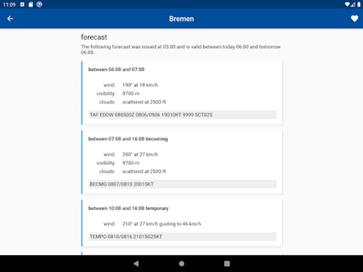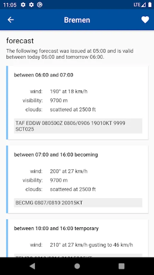 The aviation weather app enables local and global aviation weather reports to be called up reliably and quickly. The METAR and TAF messages are displayed in decoded form. Individual stations can be saved in the favorites list. All units are configurable in the settings and can be adapted to your own needs.