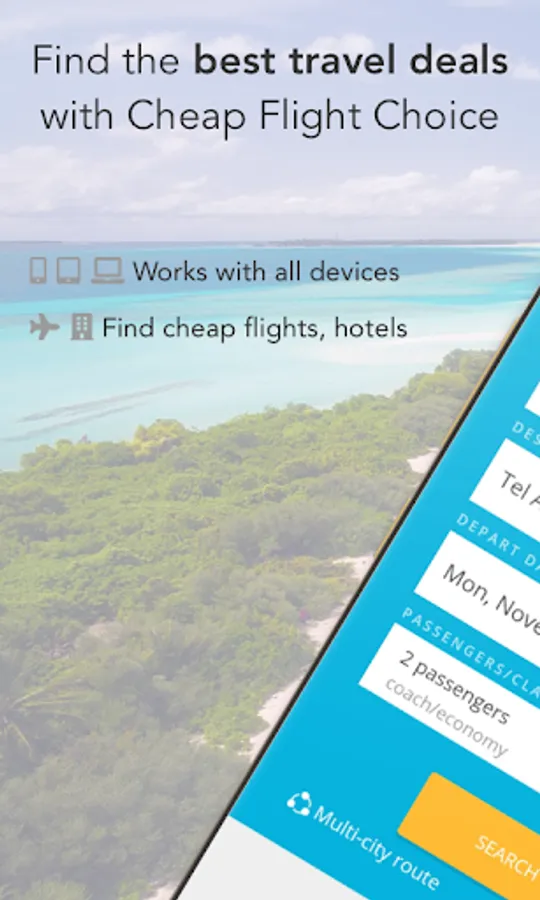 Travel cheaper with Cheap Flight Choice, one of the best travel apps around. An easy to use flight and hotel travel app that searches, compares and finds the cheapest travel deals and airfare for you. Save money and book the perfect flight or hotel with our mobile-only rates and special offers. Cheap Flight Choice - flight app lets you organize all your travel plans in one place. TRAVEL with confidence knowing you’ve found the best deals online.