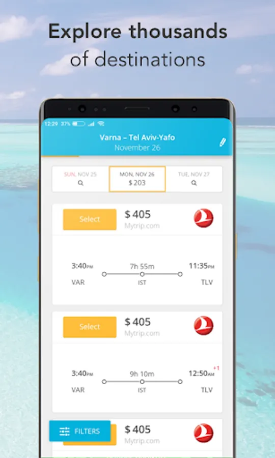 Use our travel itinerary planner feature. Pick a destination and find out when it’s best to fly. Narrow down plane tickets and airfare deals, using filters to get custom predictions about the best fares for you. Sort your results by your travel preferences. Remove long layovers, stops and hidden fees. Compare hotel prices and make your hotel reservations directly through our easy to use app.