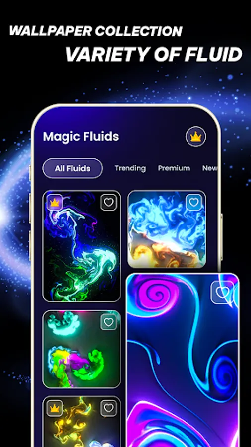 - Collection of animated wallpapers, simulating magical Fluids with eye-catching shapes and colors.