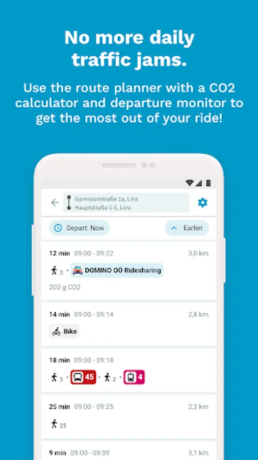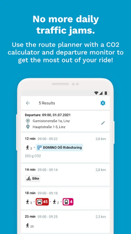 - Route planner: Select your location or a desired address as the starting point for your daily routes in the Linz area. Use the filter and sort function to get recommendations for routes. The app calculates them according to your preferences. You can choose between walking, public transport, cycling, your own car and a ride with colleagues via the new DOMINO OÖ Ridesharing