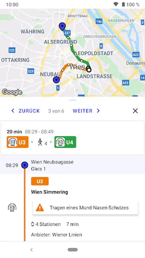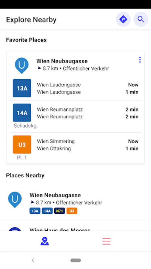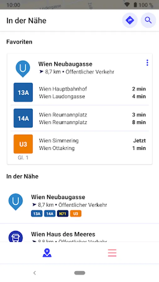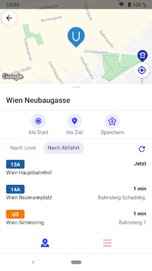 • Nearby: wannda comes with an integrated map that shows your current location, all the public transport stations next to you and how long it takes you to get there. You can set your current location as the starting point of your route to get to know the exact arrival time at your chosen destination. The map also shows all surrounding GOLDBECK car parks in Vienna.