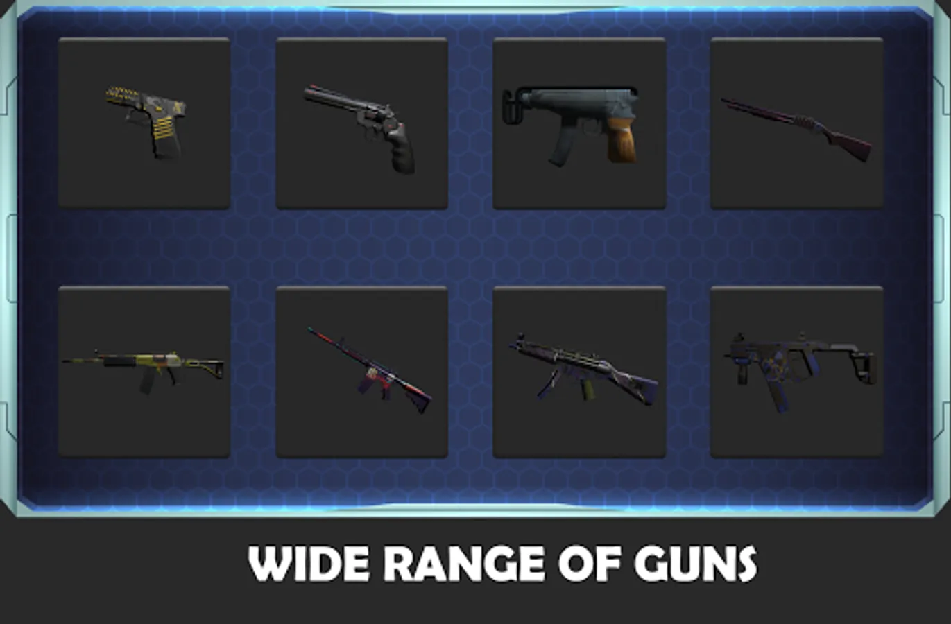 different simulator guns like shotgun, ak47, machine gun, smg, colt armory, revolver and many more along-with their sound affect.