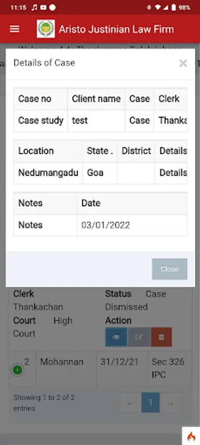 Aristo Justinian Law Firm App ( AristoJ) is used to track the court case details and its dates and related informations of the clients, by the advocates associated with ARISTO JUSTINIAN LAW FIRM. The data includes details of the case like client name, case numbers, posting dates, actions taken by advocates, Advocate clerks actions on the case Etc. This will help the Lawyer associates of Aristo Justinian Law Firm to track their cases, wherever the court location may be.