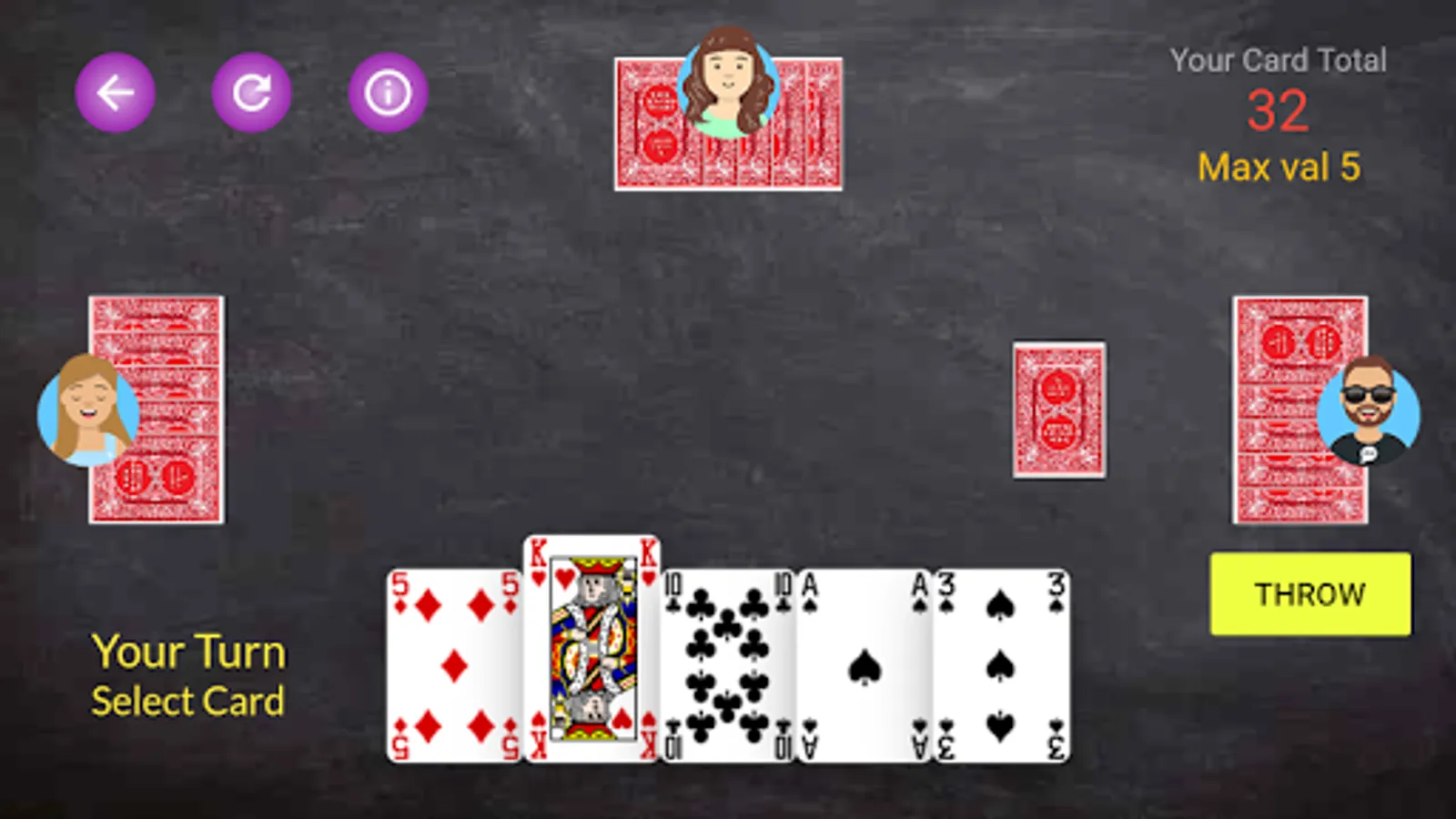 Dhumbal or Jhyap is an interesting and easy card game played with 52 cards in deck. Five cards are distributed to each player. The player with the lowest points among the players when any player shows the card wins the game. The objective of a player should be to make a set or a pure sequence, so that player can throw multiple cards and decrease cards in hand and subsequently reduce the total sum of face value of card. You can throw a single card at a time or multiple cards at a time if cards are a set or a pure sequence but you can pick only one either from the deck or from cards thrown by the player on the left You can only pick cards thrown by another player if you have thrown a set or pure sequence at least once in game.