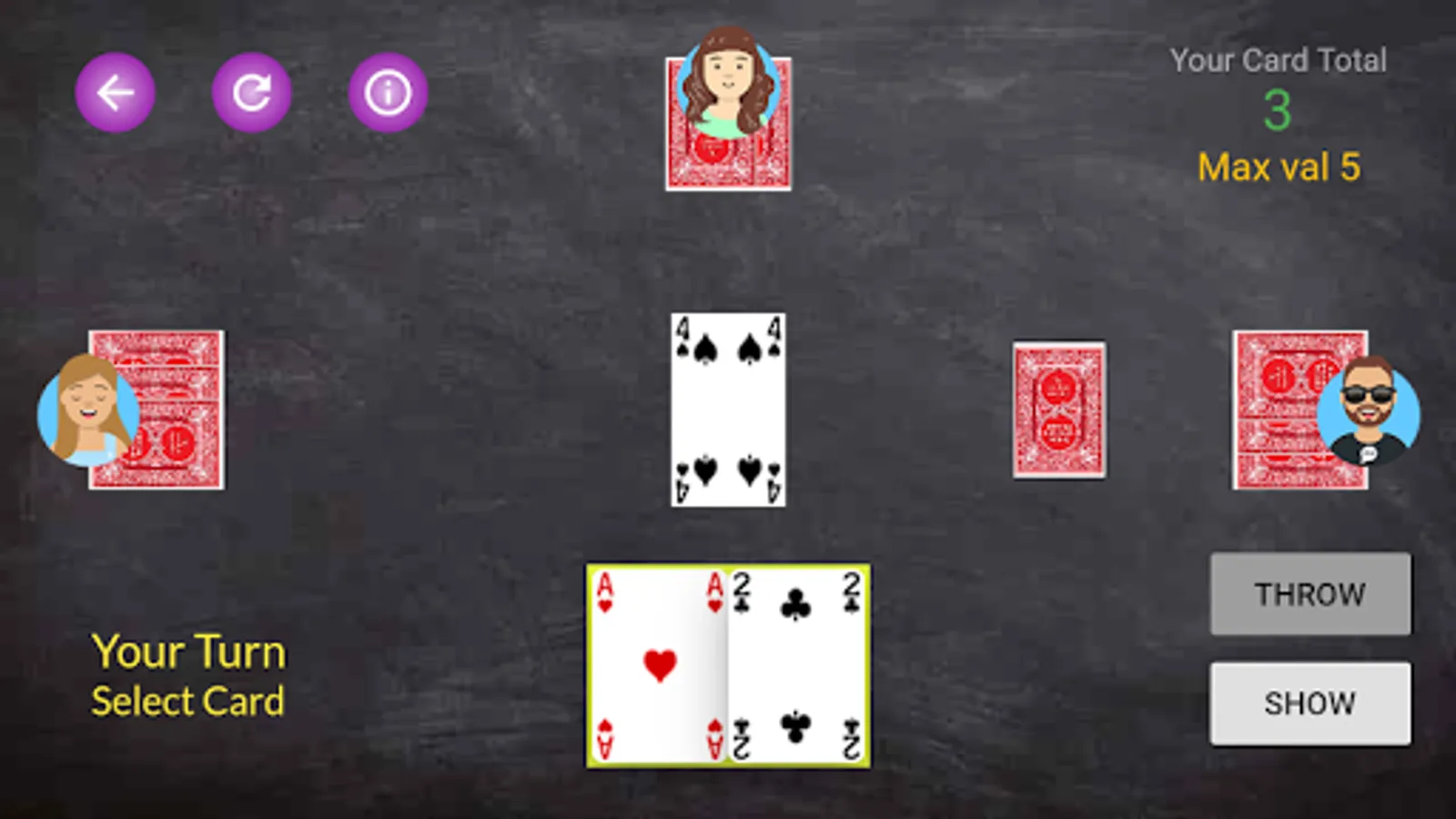 Any player can show cards if they have a sum of face value of cards less than or equal to five.