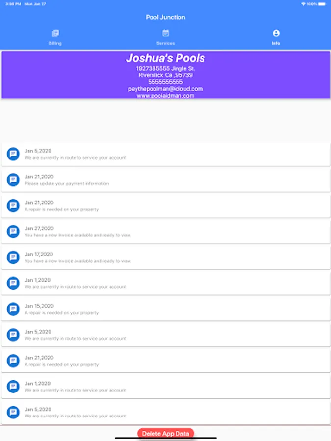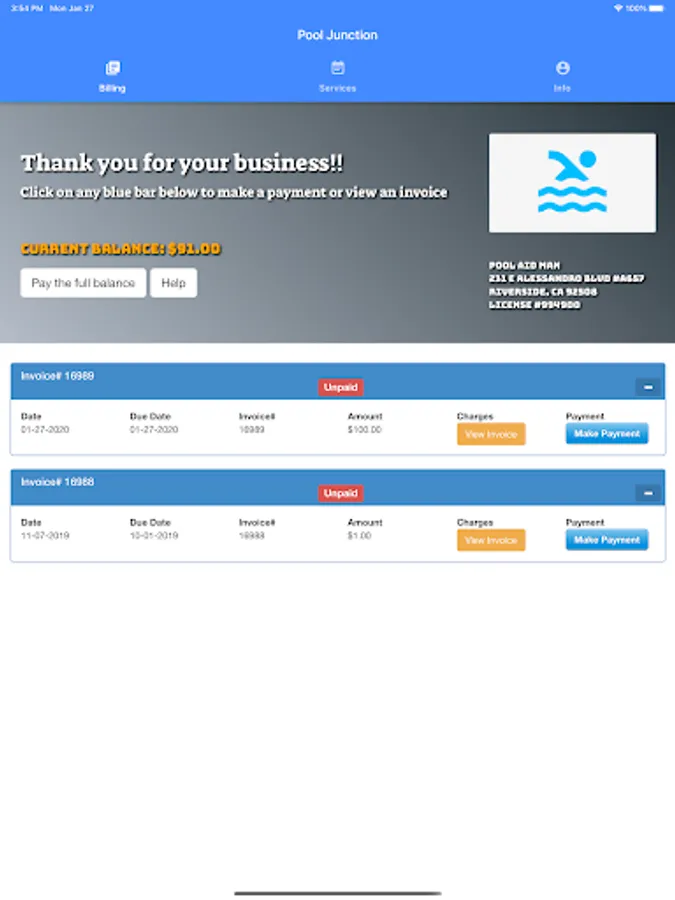 Pool Junction connects pool owners to their service and repair companies. Making it easy to view and pay your invoices, approve bids to get work started right away and to view a service log or services received with images and notes. Pool junction makes it easy to communicate with your pool professional. Brought to you by the makers of https://www.paythepoolman.com