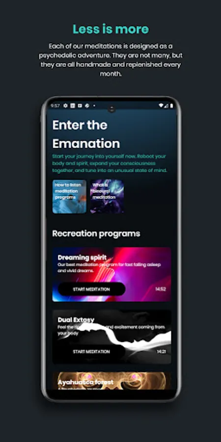 Emanation meditation compositions consist of two components: binaural noises that change the state of the brain and methylated music and sounds that tune in to a certain mood.