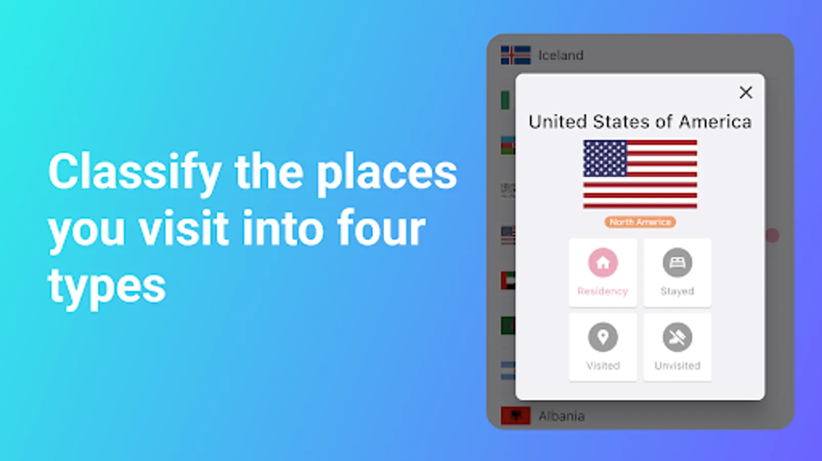 Visits can be categorized into three types: Residency, Lodging, and Visits, and the white map will be filled with the respective colors.