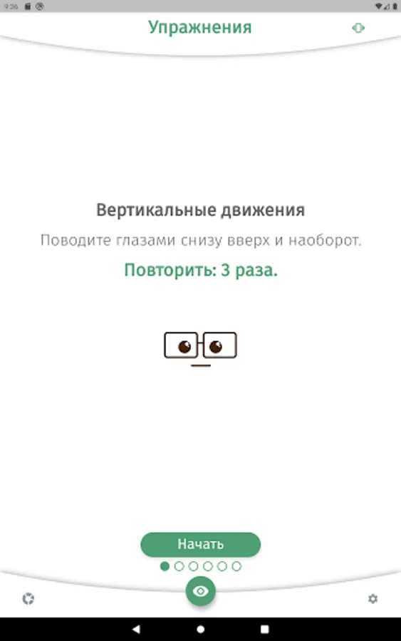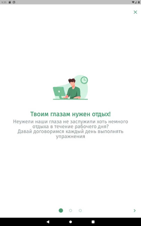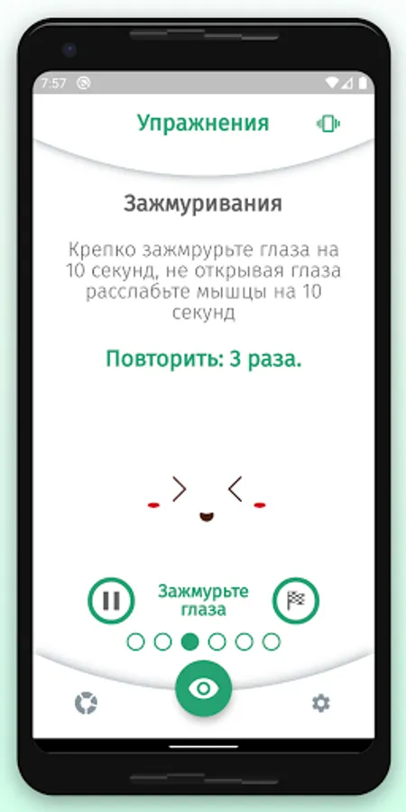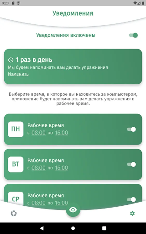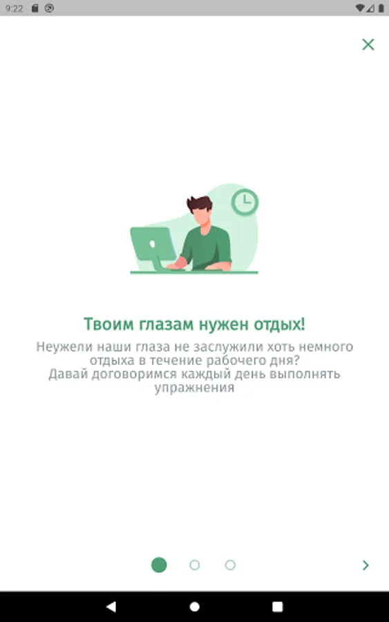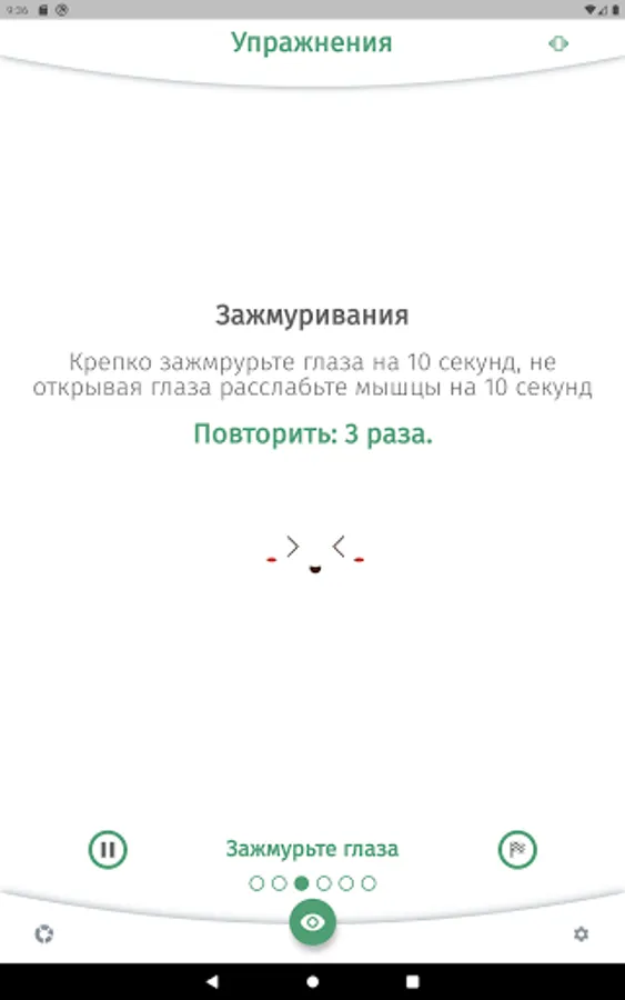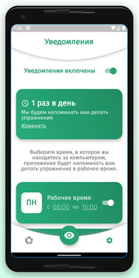 The app is designed to aid in eye relaxation and vision restoration exercises. The application will remind you to do the exercise during the working day or at a user-specified time of the day.