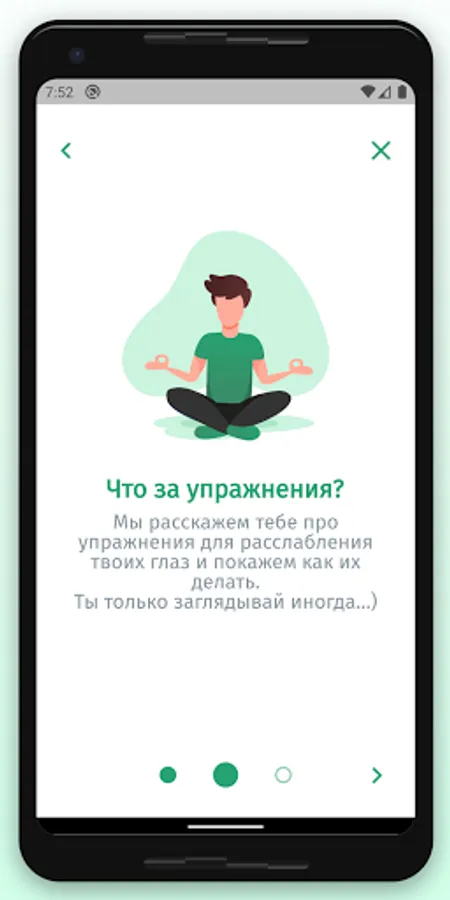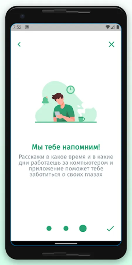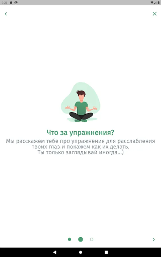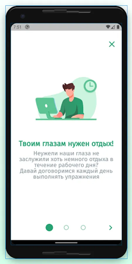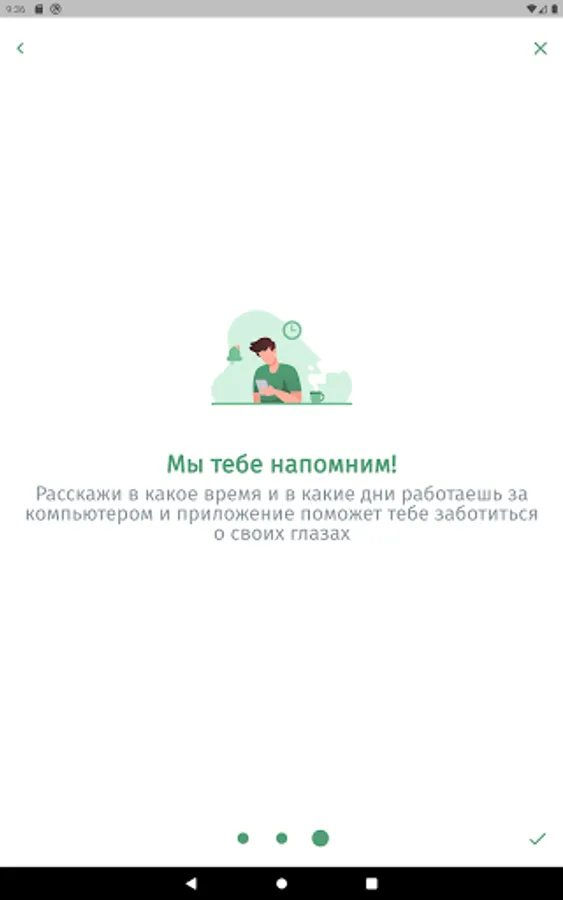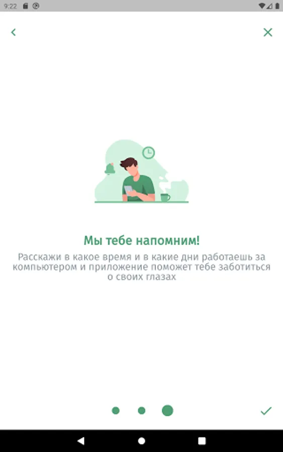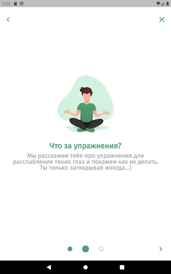 The app is designed to aid in eye relaxation and vision restoration exercises. The application will remind you to do the exercise during the working day or at a user-specified time of the day.