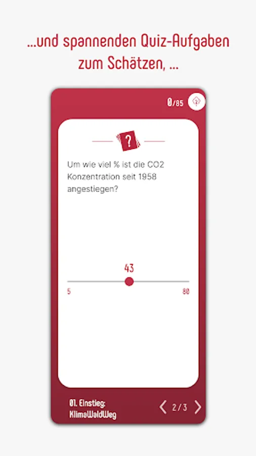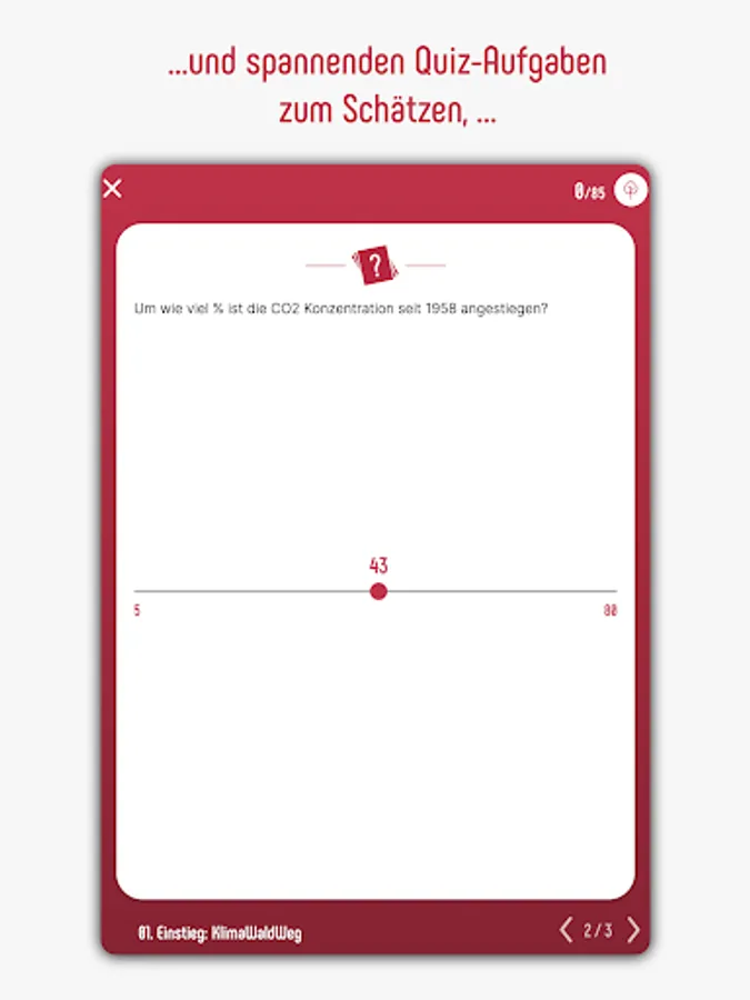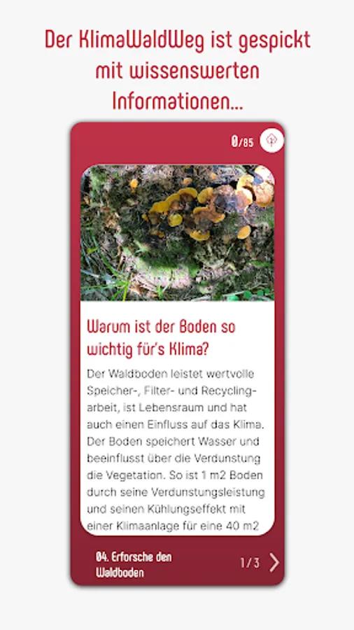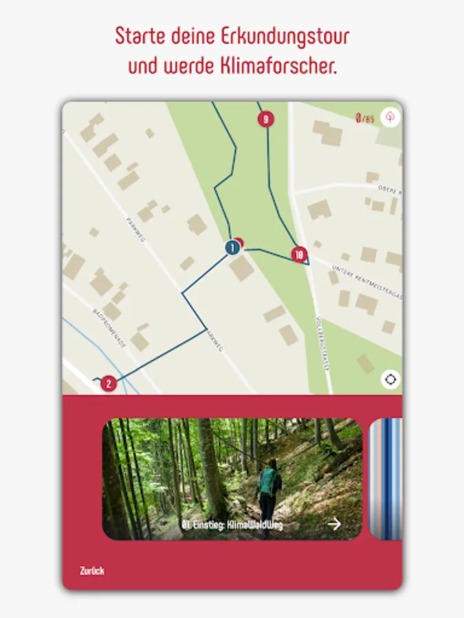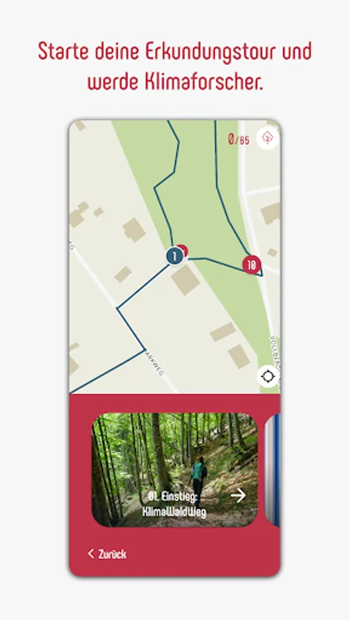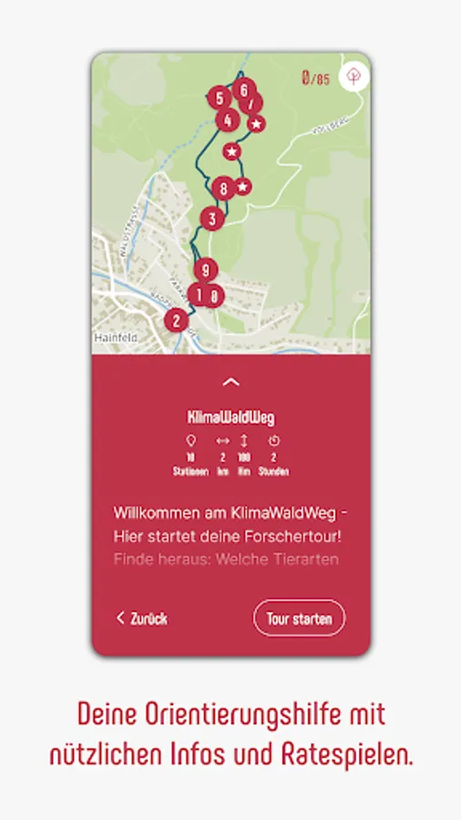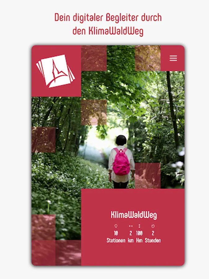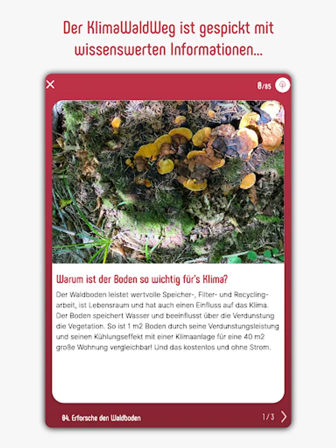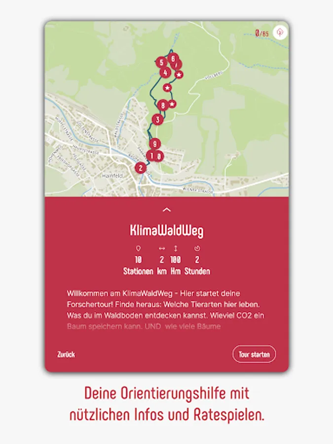 The app as your digital companion guides you through the 10 stations of the KlimaWaldWeg and provides you with useful background information. In the form of texts, graphics and quizzes, the connections between the forest and climate change are explained in a comprehensible way and made tangible using hands-on stations on site. Whoever answers the questions in the app correctly and solves the riddle collects points and receives a research certificate at the end. An exciting learning and playing experience for children, school classes and adults.