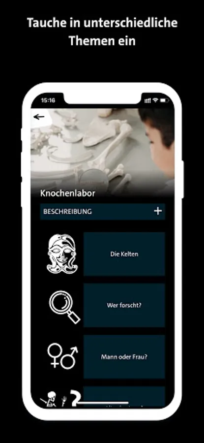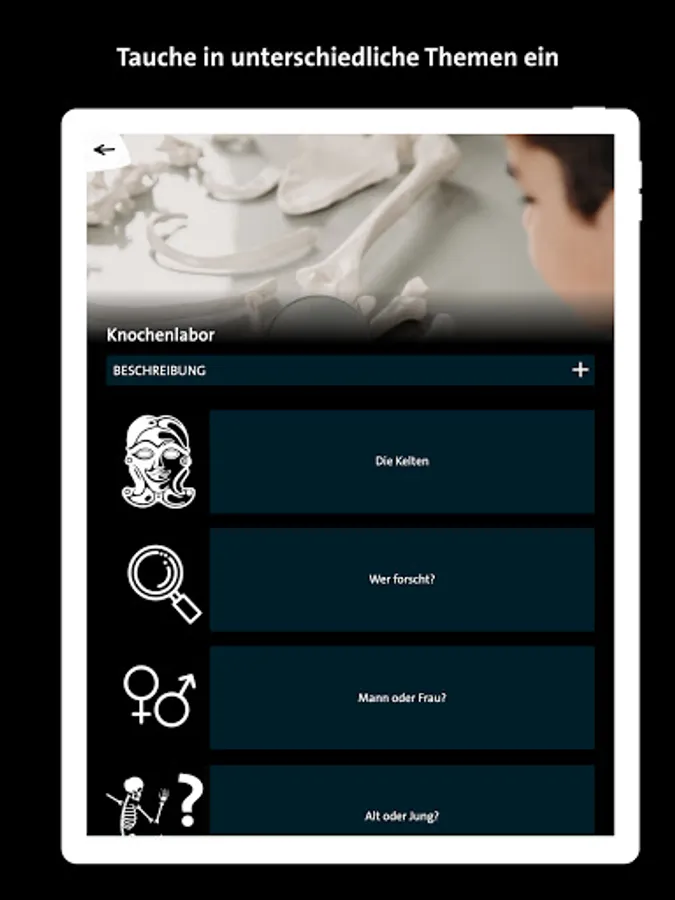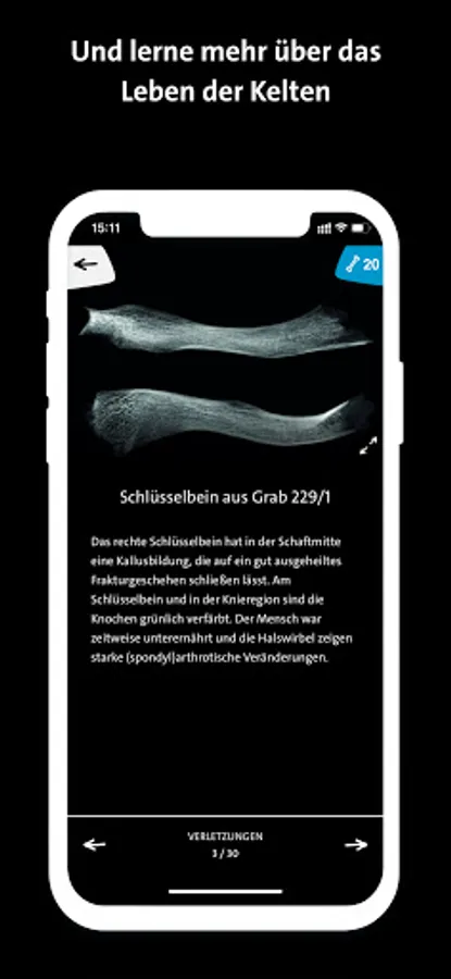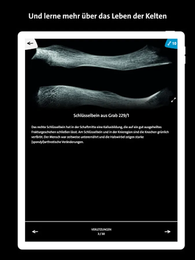 With the Celtic Museum Hallein app you will find out exciting details about the life of the Celts on the Dürrnberg 2,500 years ago! Whether at home or in the museum - the bone laboratory quiz, with pictures, videos and explanations from our anthropologist Dr. Karin invites you to research and discover independently. Try the methods of anthropological research, answer questions and collect bones. You need this in order to receive an award at the end!