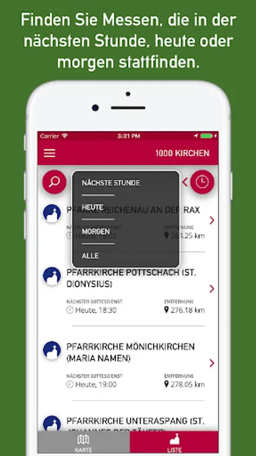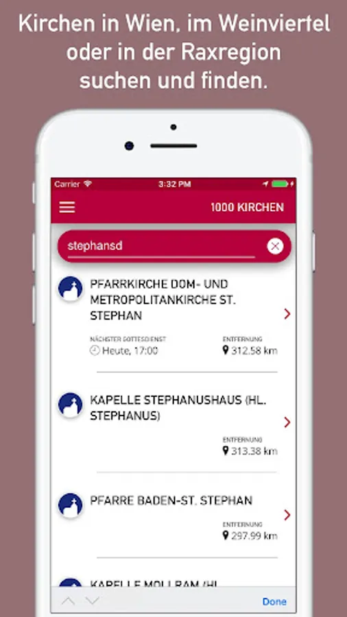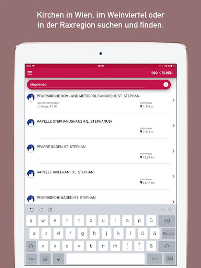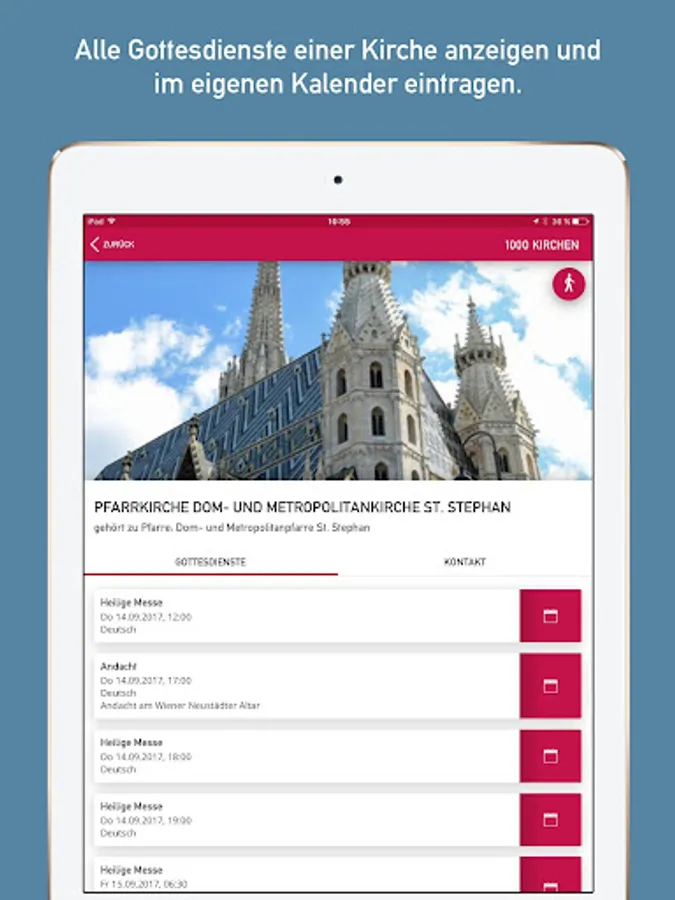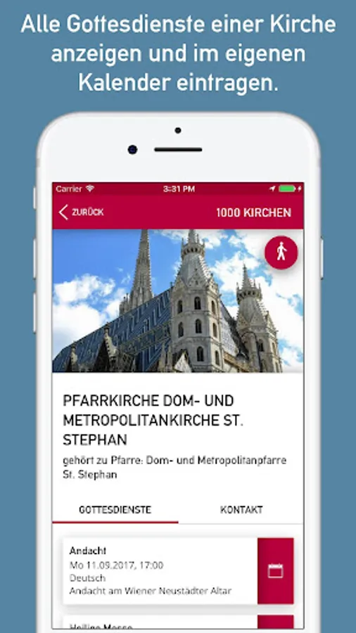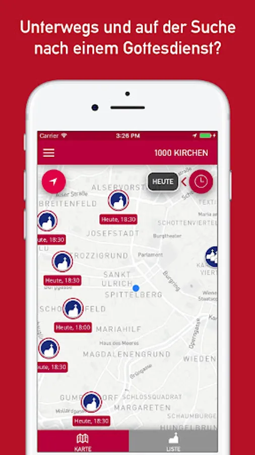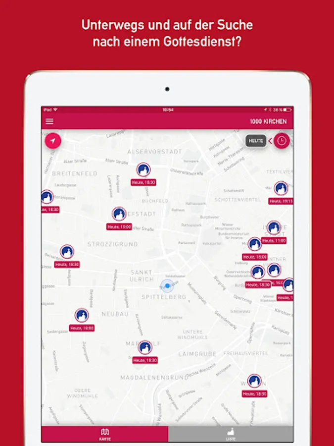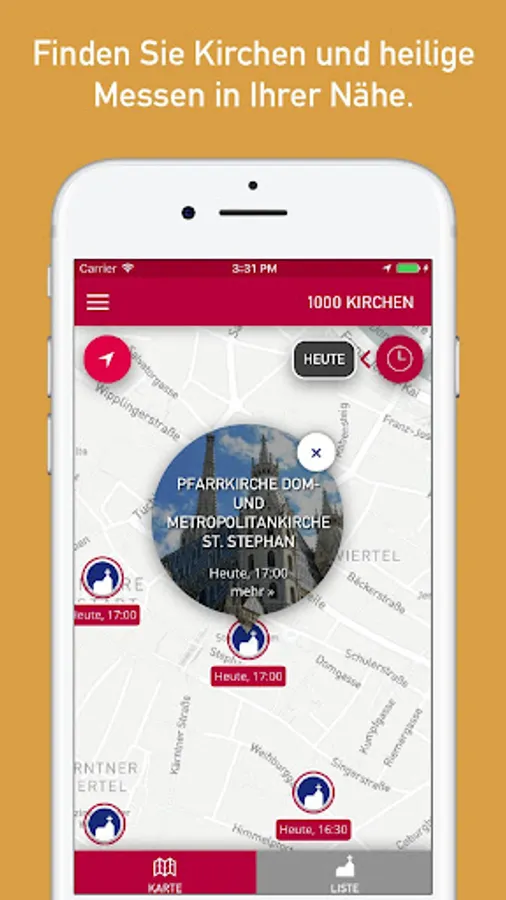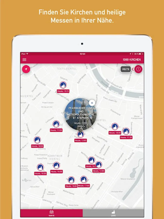 The 1000 Church app gives you the chance to find Masses in your area that take place in the coming hours today or tomorrow. You can easily find a church near your current location or throughout the Archdiocese of Vienna. Whether in the center of Vienna, in the wine quarter or in the Raxregion you find the right service for you!