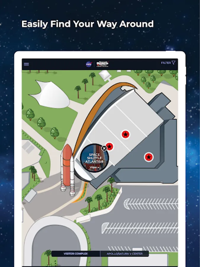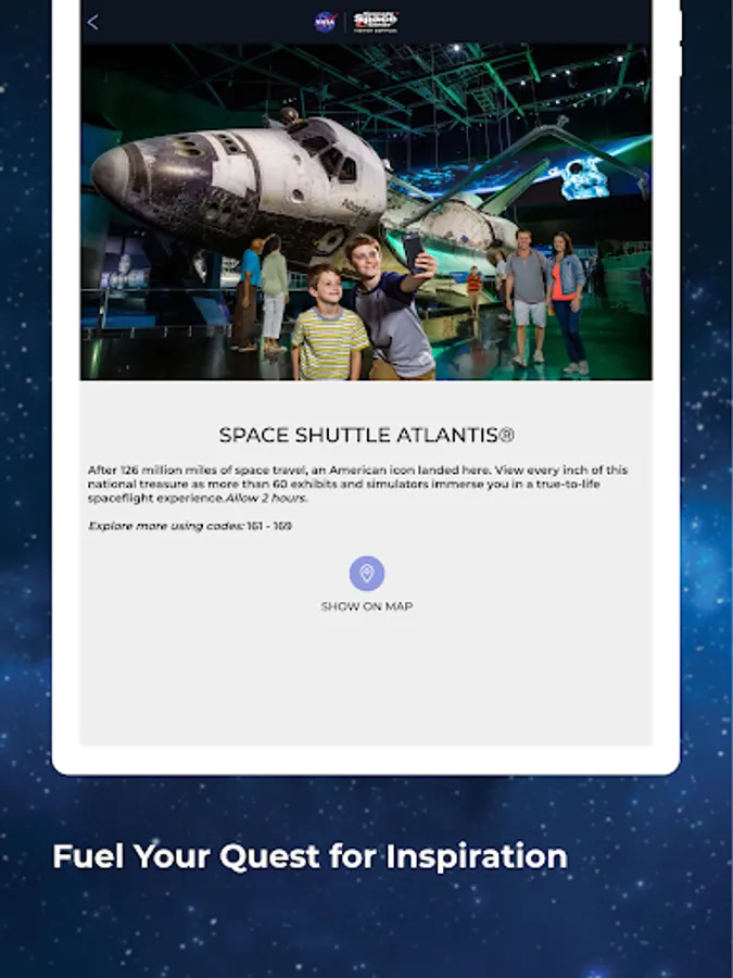 Explore the Kennedy Space Center Visitor Complex with the new KSC SmartGuide! Your device is a digital tour guide that offers guests a customized tour experience with audio, maps, fascinating facts, historic and current photographs, and video. Experience a journey through the complex in any of the eight languages available with information for attractions and exhibits. This is the perfect tool for a translated tour. Multilingual and ADA accessibility.