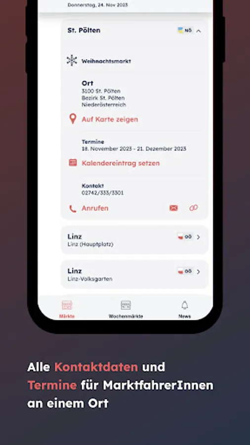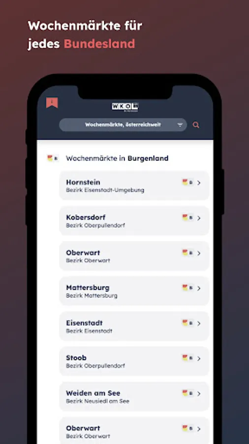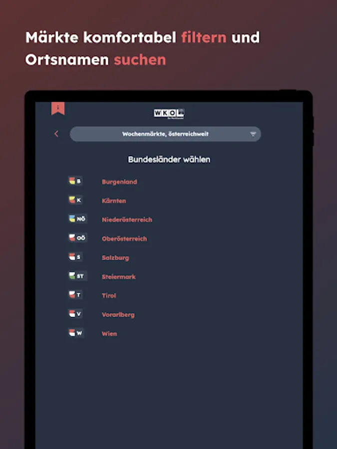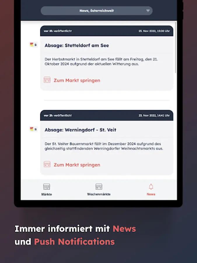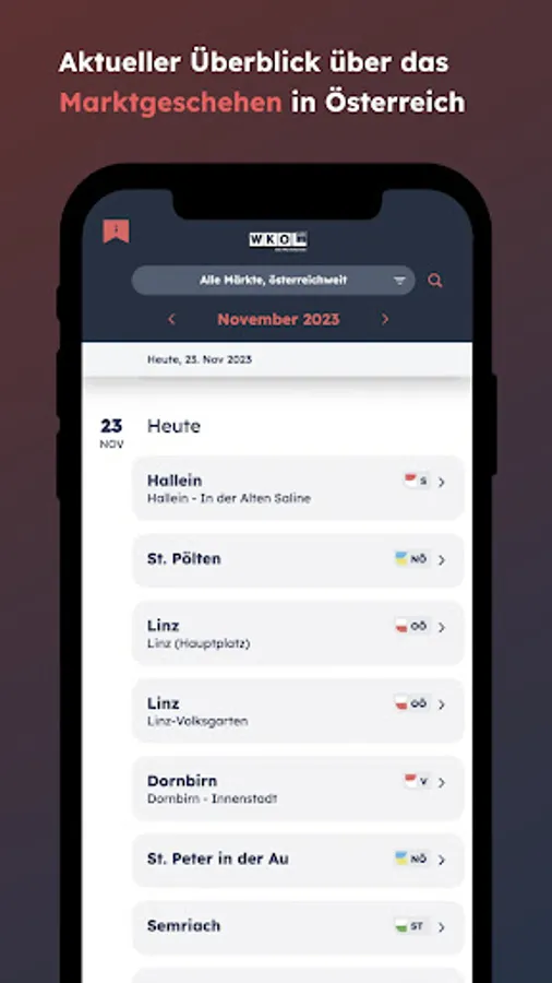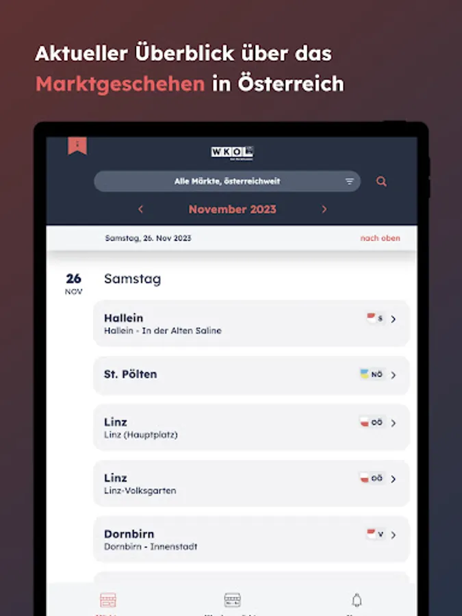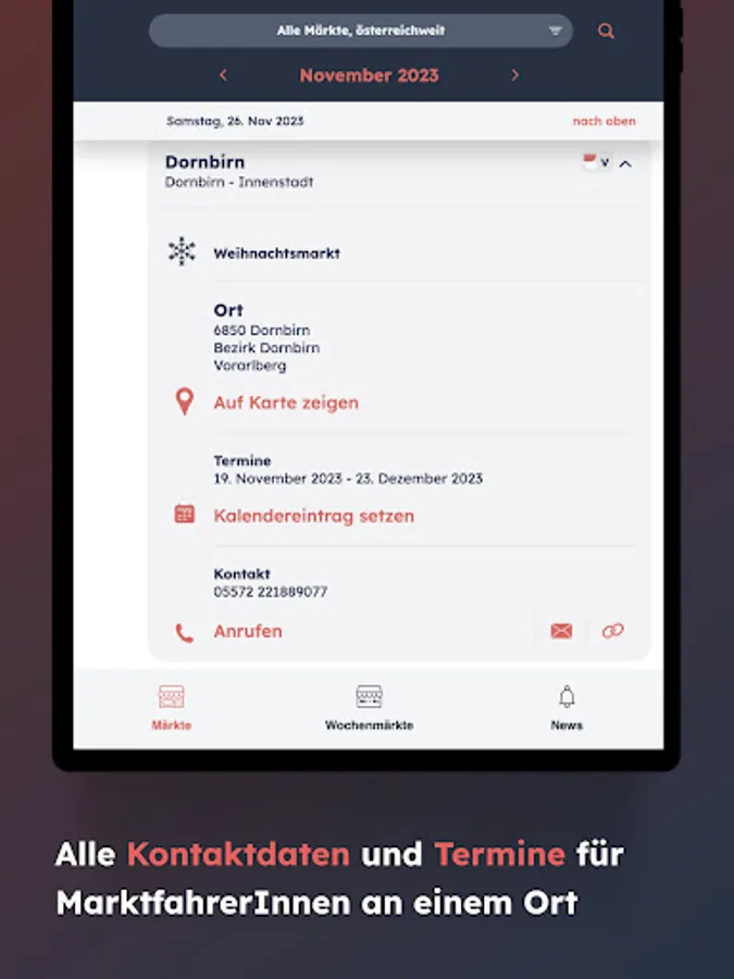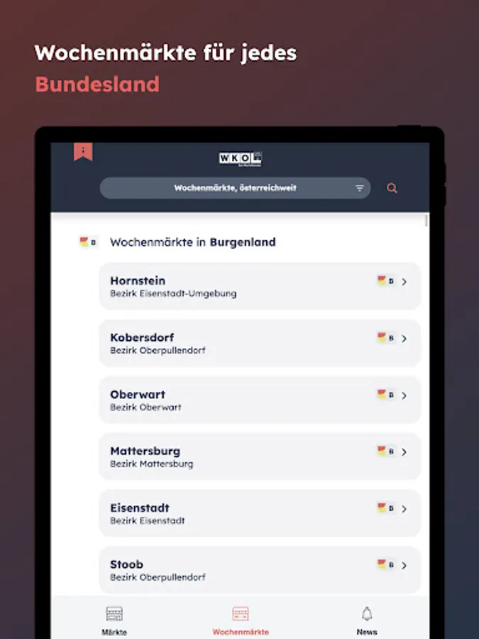 The Market Directory Austria provides market drivers and customers with an up-to-date overview of what is happening on the market throughout Austria. The app offers market drivers an intuitive search for place names and can be easily filtered according to federal states and market types - including contact details for the market organizers. Markets, weekly markets, news - everything at a glance!