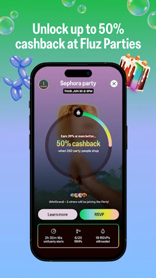 • Parties are collective earnings events where you and your friends can earn up to 50% cashback together.