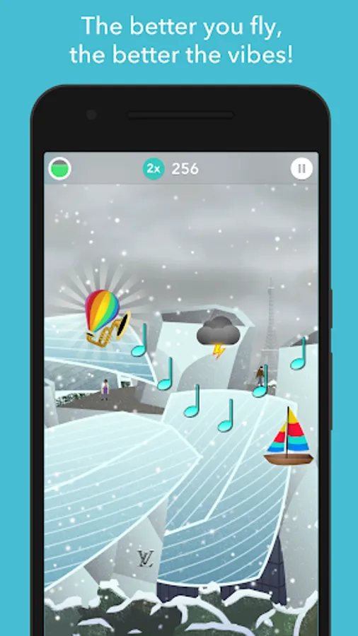 Collect as many notes as you can by guiding your ‘tuballon’ above the sails of Frank Gehry’s iconic building in Paris. Steer clear of the crazy floating obstacles and unlock four energetic levels, inspired by the dynamic architecture and life at the Fondation Louis Vuitton.
