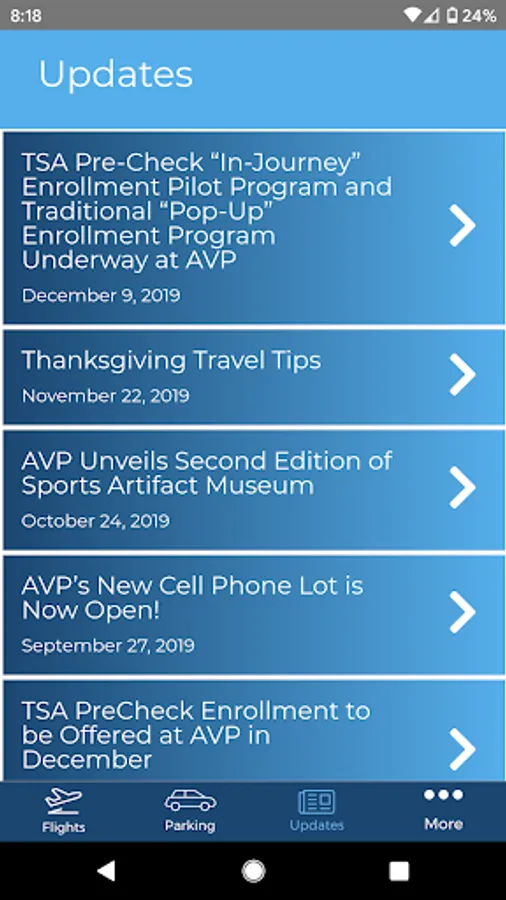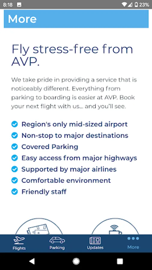 The FlyAVP app lets you easily access up-to-date information about the Wilkes-Barre/Scranton International Airport including parking data, local lodging and transportation options, airport updates, featured airport amenities, a terminal map and more.